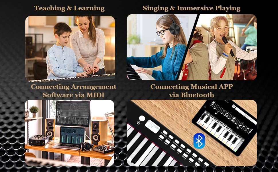 Wireless Connection & Multiple Jacks: You can connect the keyboard with different equipment, including smartphones, tablets, and computers via wireless or MIDI/USB connection to fully explore the possibility of the digital instrument. It is also compatible to your headphones, microphones and speakers.