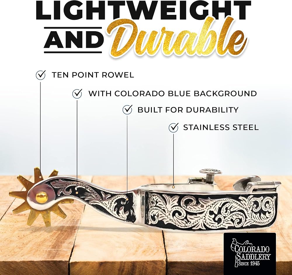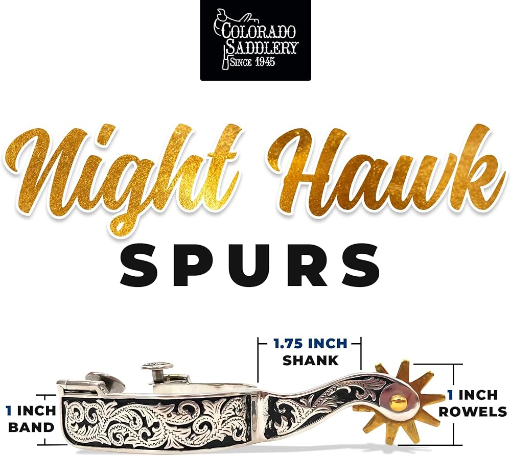 • WESTERN STEEL SPURS: The Night Hawk Spurs have a stainless steel spur design, blending the new and the old into a great looking spur. They have a Colorado blue background with polished stainless steel etching, perfect for that western aesthetic.