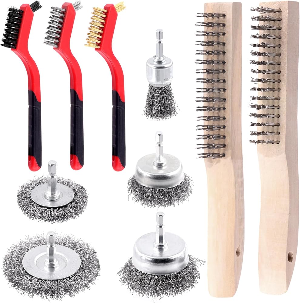 Tanstic 10Pcs Wire Brush Set, Includes Stainless/Carbon Steel Wood Wire Brush, Nylon/Brass/Stainless Steel Bristles with Plastic Handle, Drill Wire Brush with 1/4" Hex Shank for Paint Rust Removal