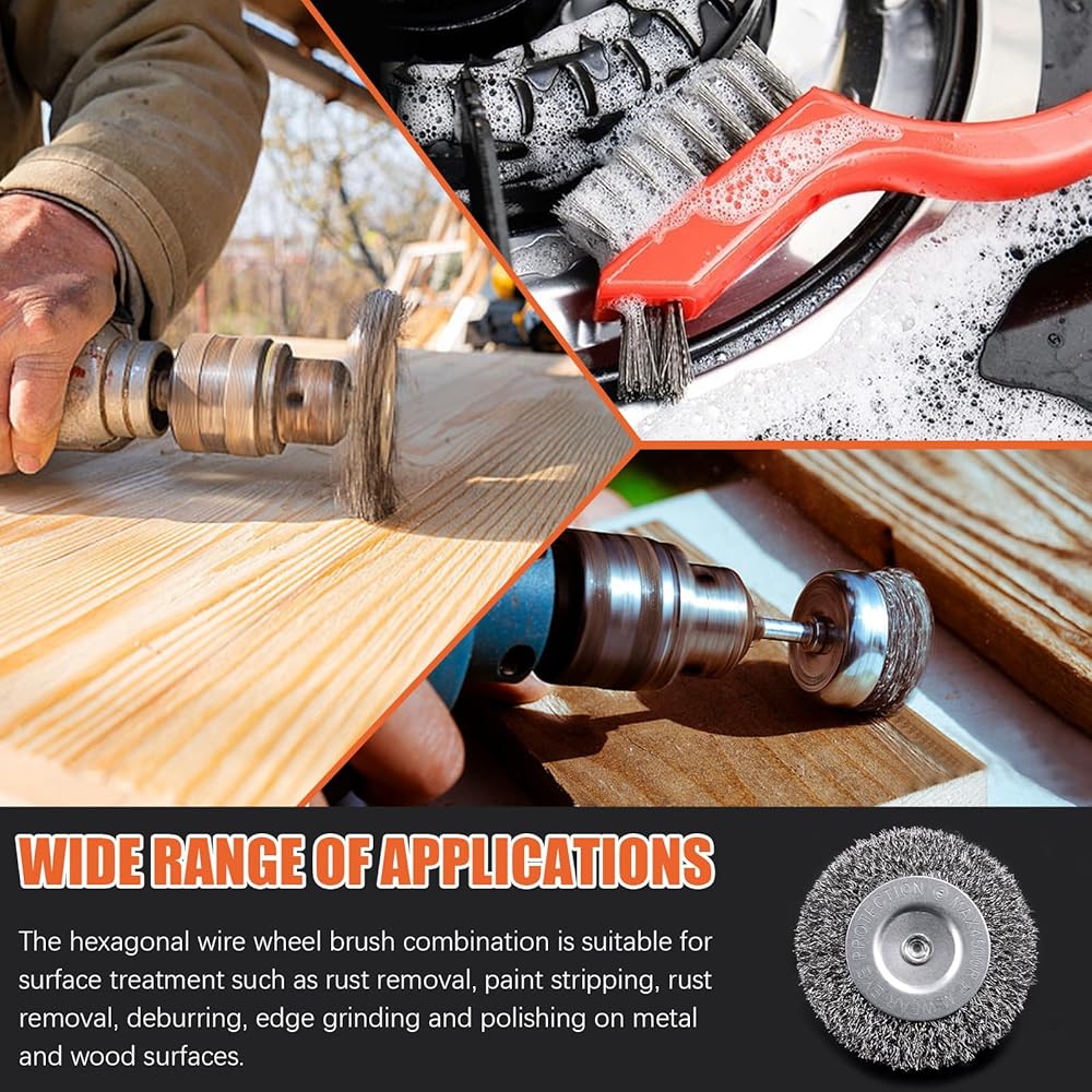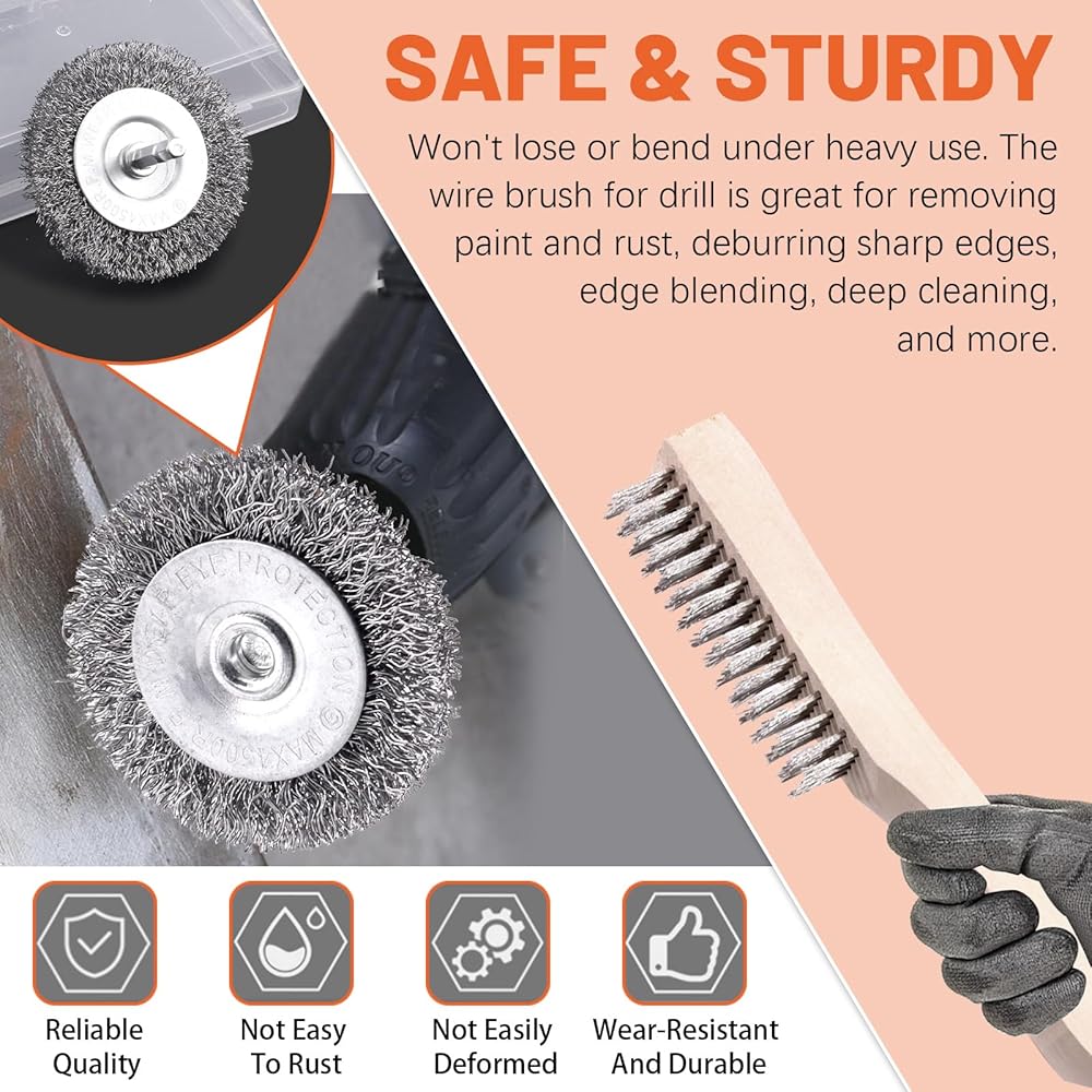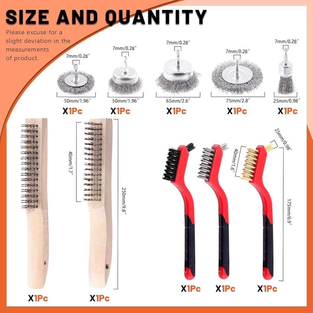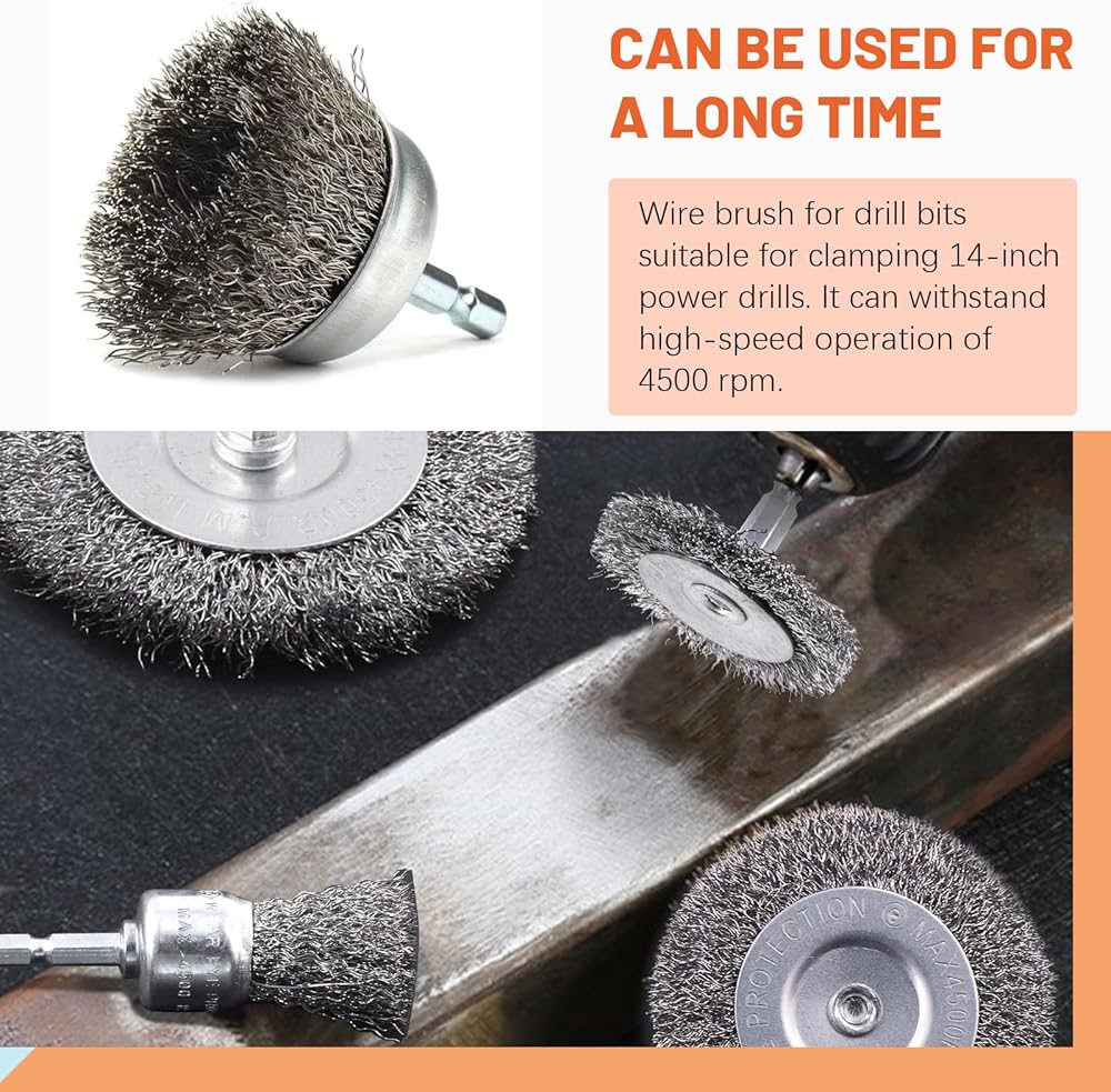 🌟 There are 3 types of wire brushes for drill, the 2” and 2-1/2” wire cup brushes are suitable for flat surface, the 2” and 3” wire wheel brushes are great for slits or grooves and the 1” wire pen brush is best for narrow holes or areas.