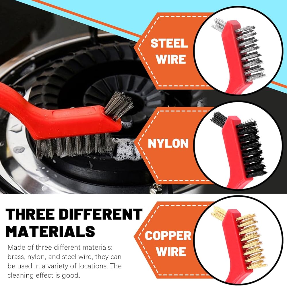🌟 There wire brushes with plastic handle are specially designed with different bristles for different purposes. Stainless steel brush is suitable for removing parts that requires heavy duty scrubbing and rust on the machine. The nylon brush is suitable for gentle cleaning, such as cleaning of delicate household appliances. While the brass brush has good abrasive cleaning effect to clean metal surfaces without scratching.