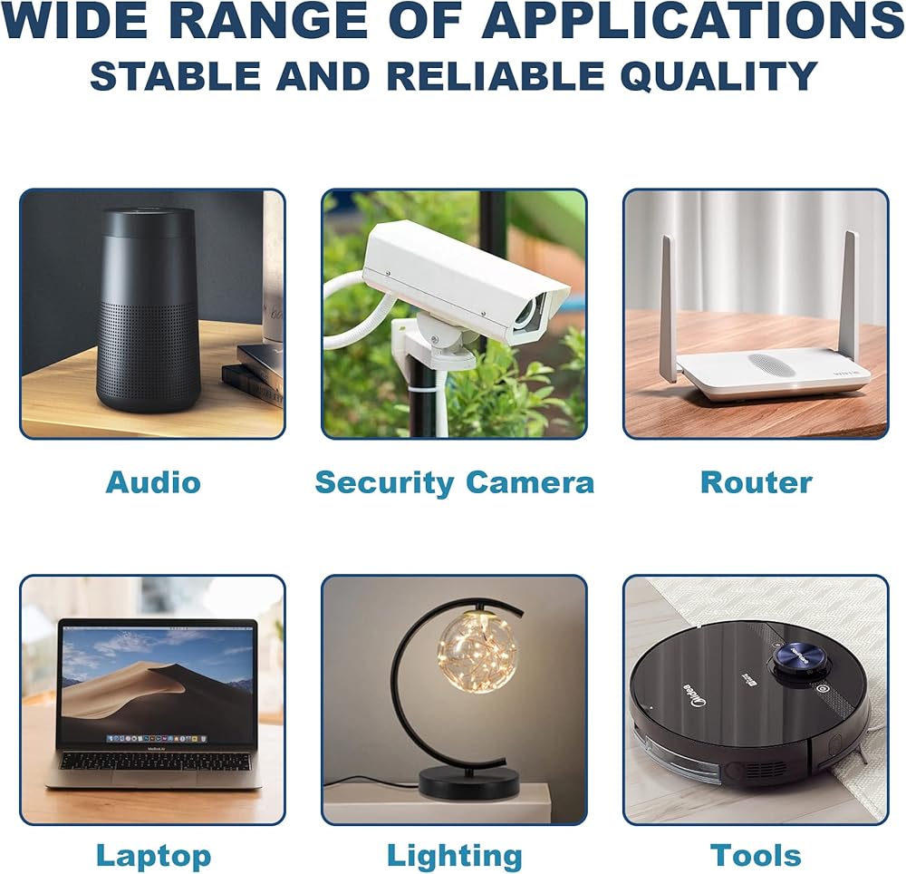 【توافق واسع】يتوافق محول الطاقة هذا مع مجموعة واسعة من الأجهزة الإلكترونية، بما في ذلك أجهزة الكمبيوتر المحمولة والشاشات وأجهزة التوجيه والطابعات والمزيد.