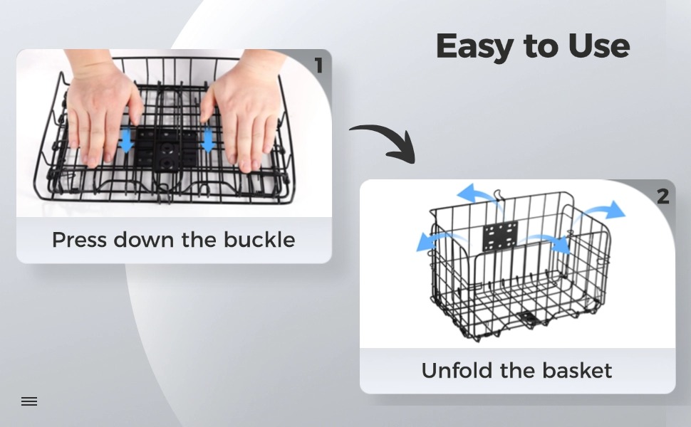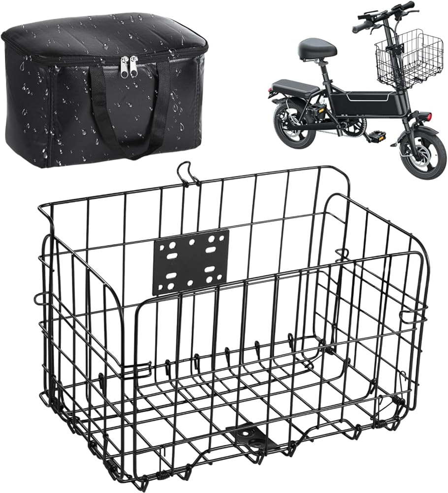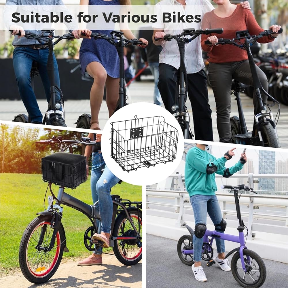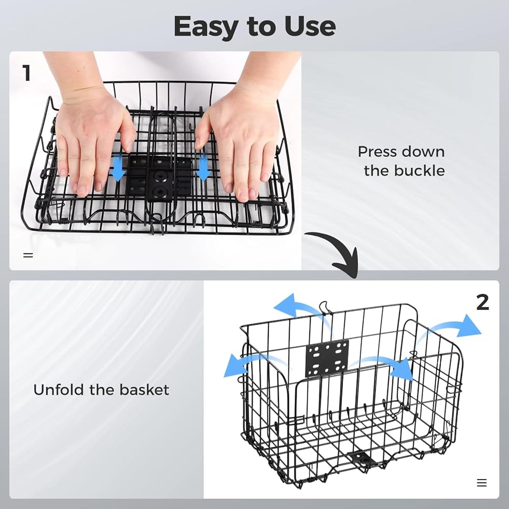 تصميم قابل للطي ودائم: تتميز سلة الدراجة الأمامية بتصميم قابل للطي مريح ، مصنوع من سلك فولاذي قوي مع تشطيب طلاء أسود مقاوم للصدأ. إنه مثالي لحمل الكلاب والحيوانات الأليفة وغيرها من الضروريات على سكوترك الكهربائي أو الدراجة الإلكترونية