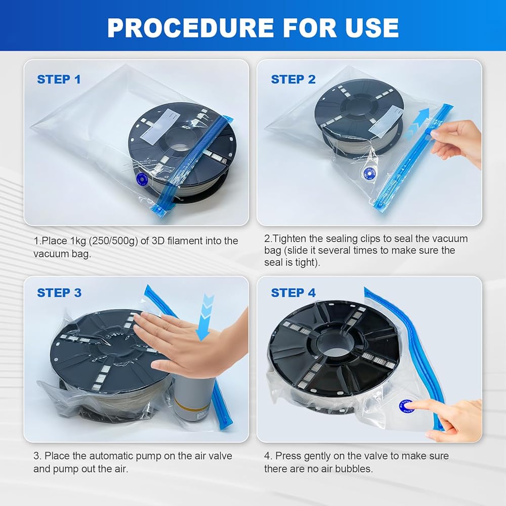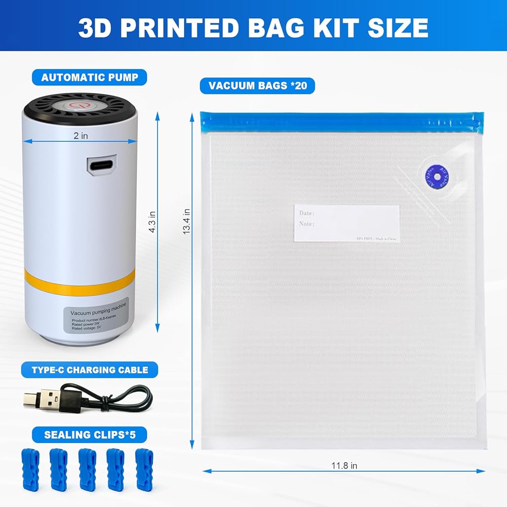 مجموعة كاملة لجميع احتياجاتك - تشمل مجموعة تخزين الخيوط الشاملة هذه 20 كيس فراغ (11.8 × 13.4 بوصة) ، مضخة فراغ واحدة مع منفذ USB و 5 مقاطع ختم. مثالية للمبتدئين وعشاق الطباعة ثلاثية الأبعاد المتمرسين على حد سواء ، تضمن هذه المجموعة تخزينًا فعالًا للخيوط ، مما يجعل خيوط الطابعة ثلاثية الأبعاد جاهزة للأداء الأمثل