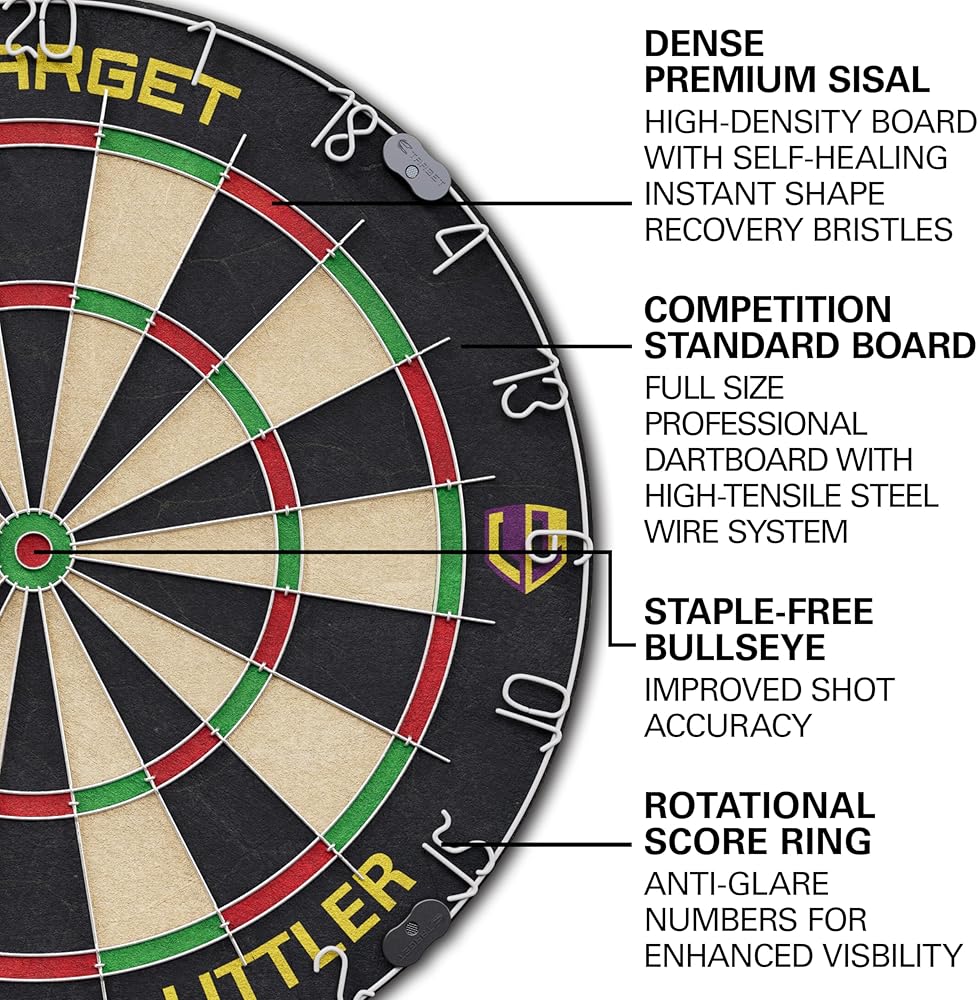 • COMPETITION STANDARD DART BOARD: The rotational score-ring dartboard features an ultra-thin wire system and staple-free bullseye for increased scoring. Shape recovery technology is provided by the self-healing African Sisal material.