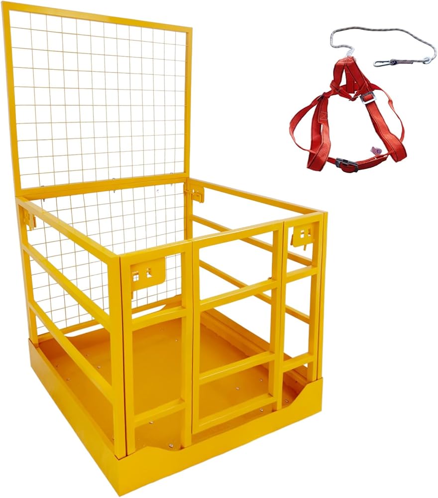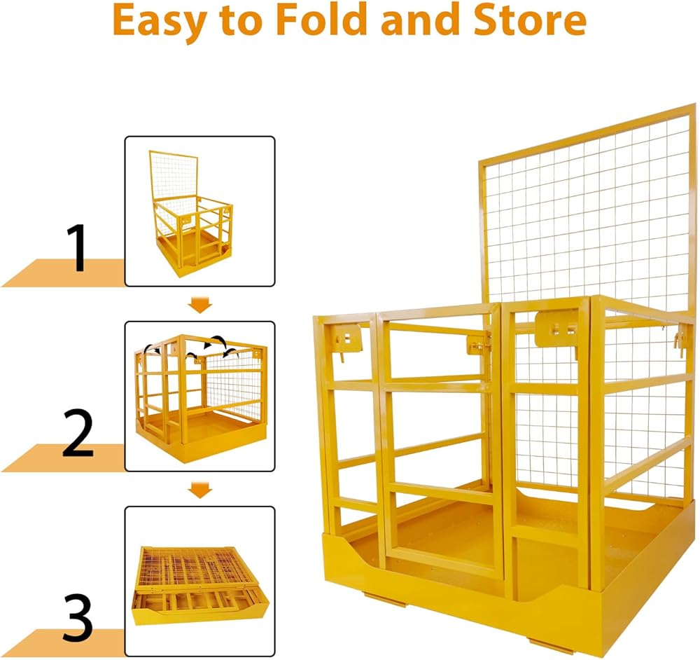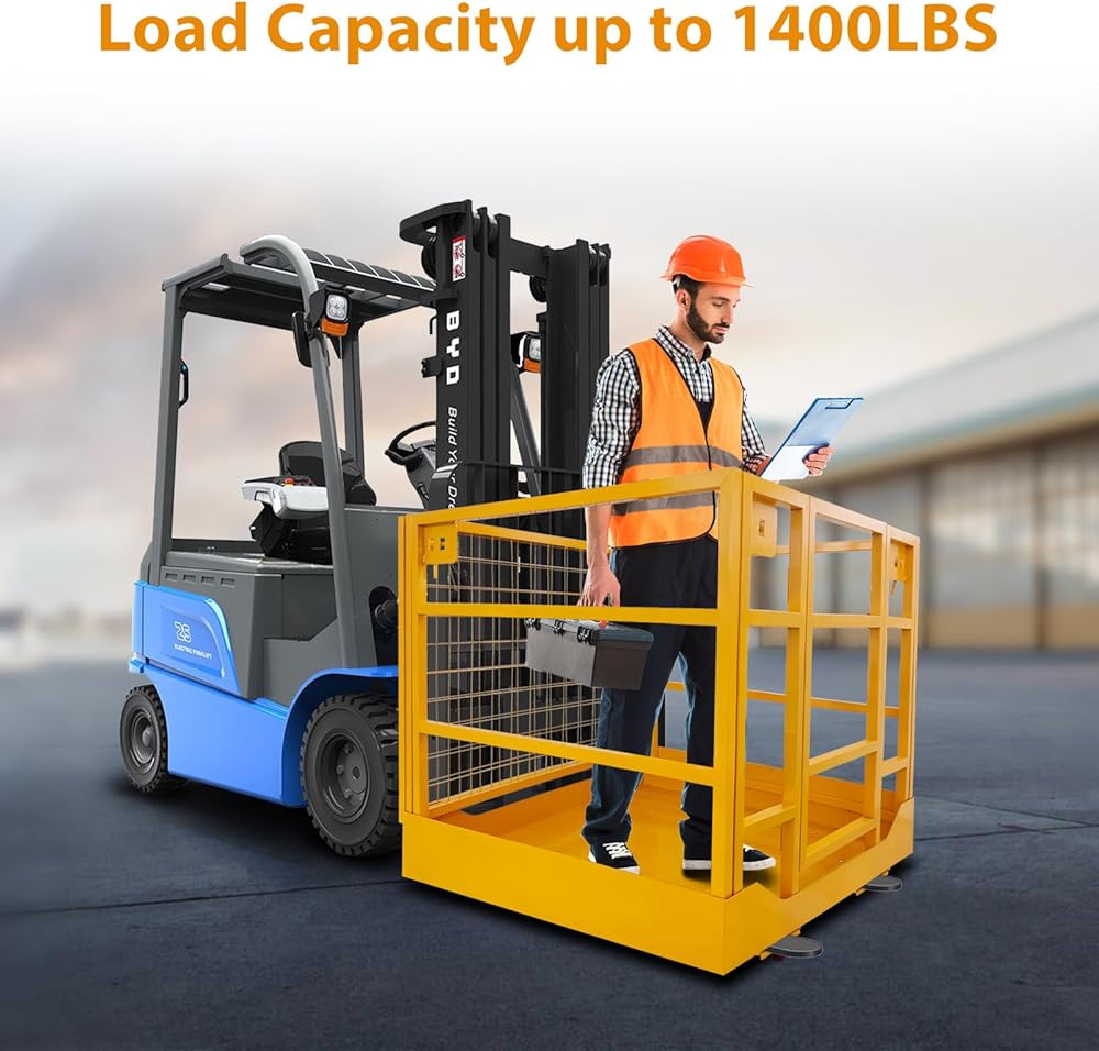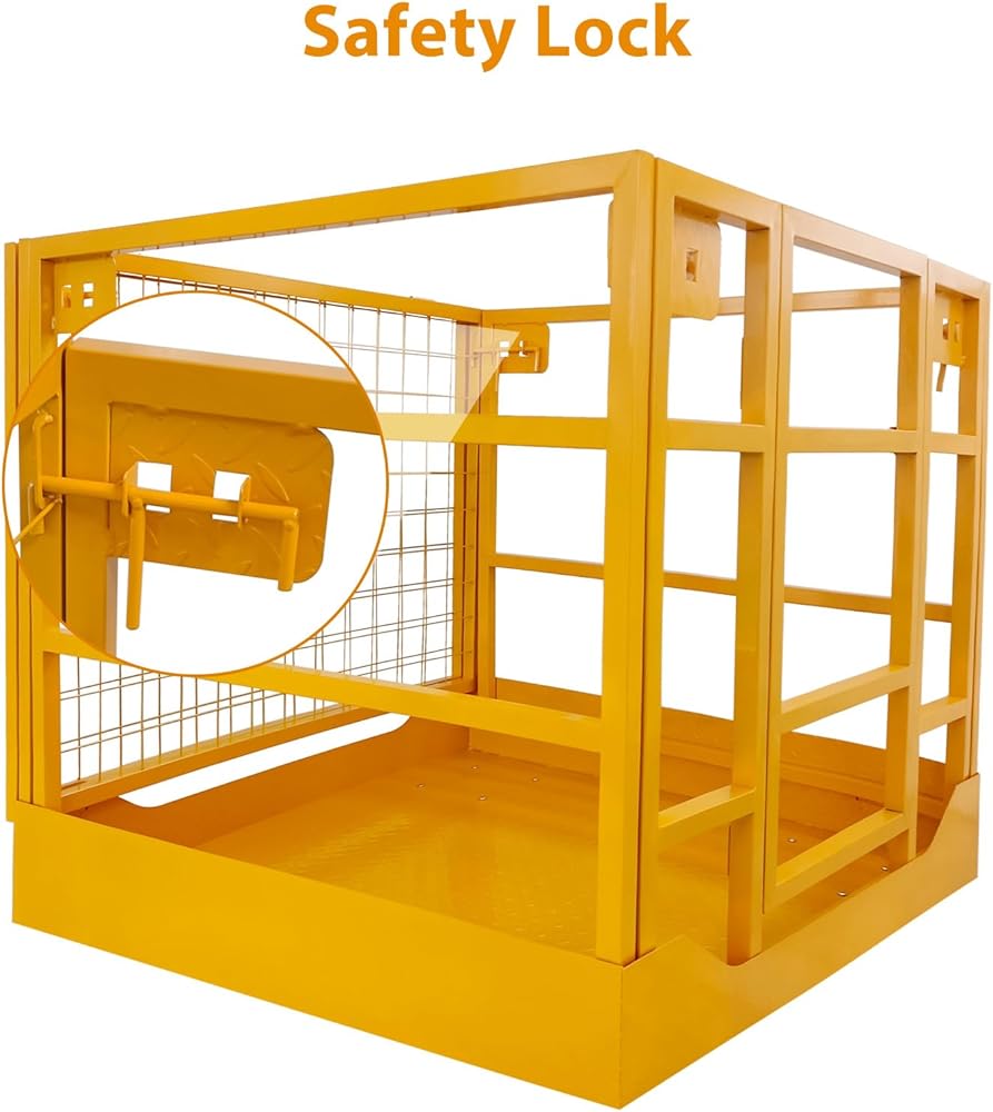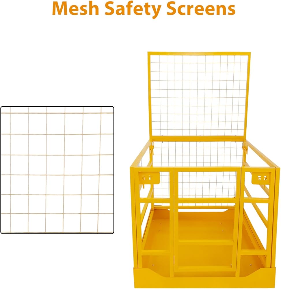 【Enhanced Safety Features & Protection】This secure forklift cage is equipped with guardrails and a non-slip floor to reduce the risk of falls and injuries. The mesh safety screen provides added security, while the double chains design enables easier access and exit.