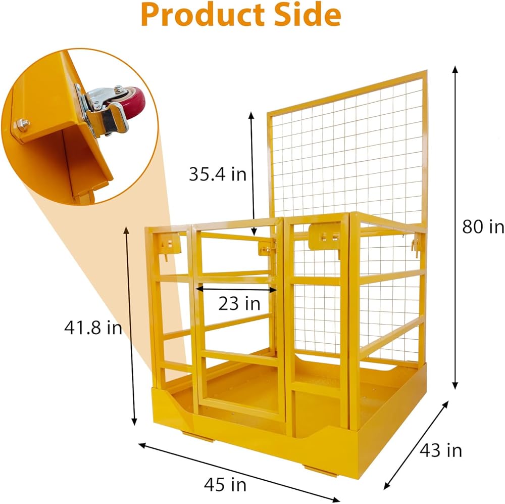 【Specifications and Warranty Assurance】This forklift work platform safety cage has dimensions 43"L x 45"W x 80"H, with a capacity of 1400 lbs. Made of steel with yellow coloring, it comes with a reliable warranty and responsive customer support.