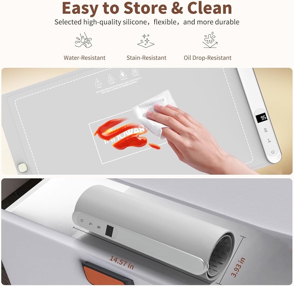 مادة السيليكون الفاخرة: صينية التسخين الكهربائية هذه مصنوعة من مادة السيليكون المرنة عالية الجودة، وهي مقاومة للرذاذ والبقع والزيوت، وتجمع بين المتانة والعملية.