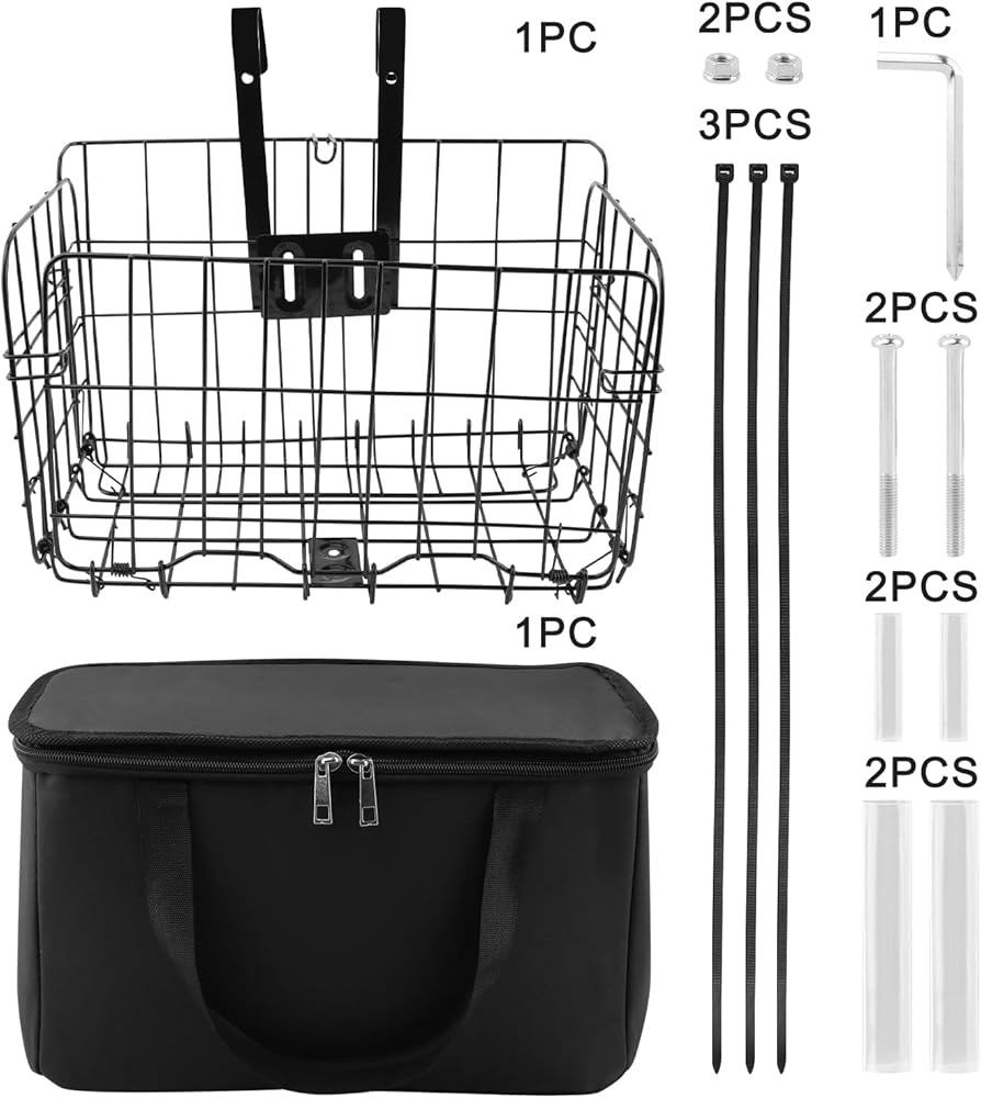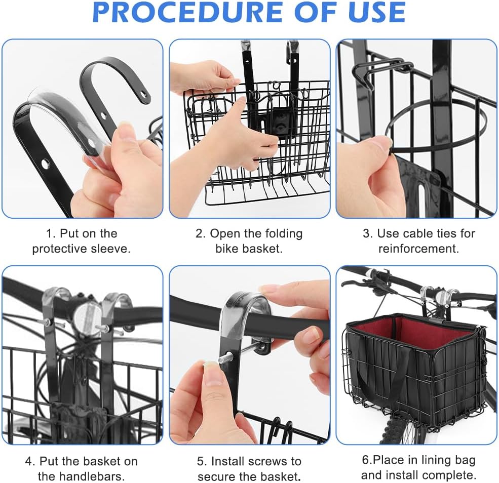 【PACKAGE INCLUDED】You will get 1pc x folding bike basket, 1pc x liner bag, 2pcs x screw, 2pcs x nut, 4pcs x protective sleeve. Screws are provided to meet different needs, and the protective sleeve prevents damage to the frame and basket from sliding.