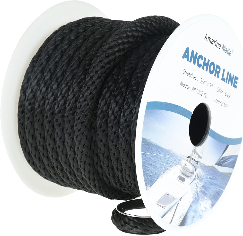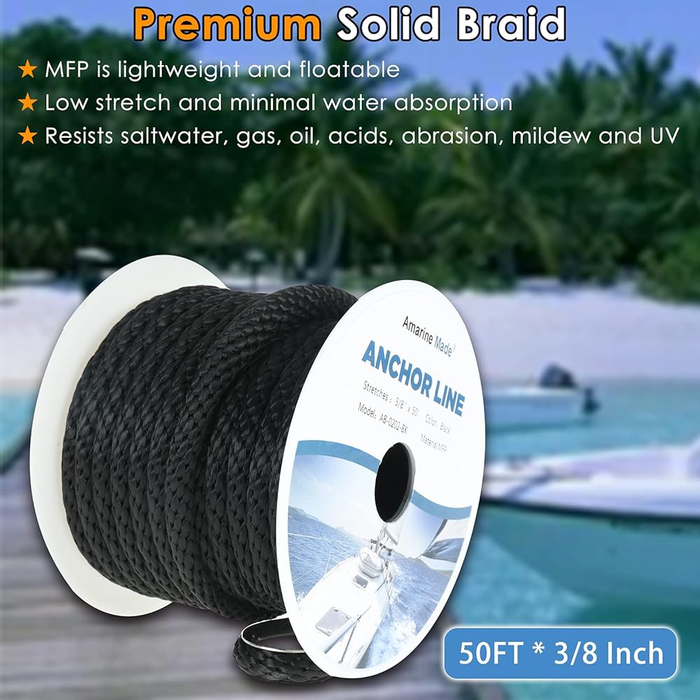 حبل قارب مصنوع من أمارين ، حبل مرساة 3/8 بوصة 50ft ، حبل مرساة جديلة الصلبة الصلبة الصلبة MFP مع حبل خزان من الفولاذ المقاوم للصدأ-800 كيلوغرام الحبل البحري (أسود 50 قدمًا)