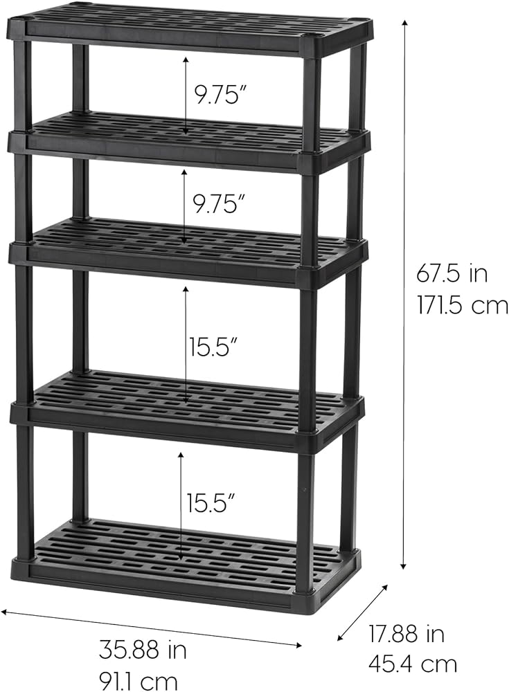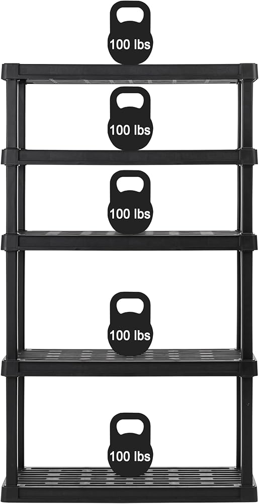 Tackle tougher messes and get organized with the IRIS USA 5-tier recycled plastic storage shelf. The fixed height shelving unit gives you a space-saving and convenient way to keep your stuff organized and within reach while the smooth matte black color easily blends in with the décor of any room in the house or garage. Use the shelving unit in the garage, pantry, basement, closet, entryway, shed, patio, utility or laundry rooms, or anywhere else where a simple yet sturdy shelf is needed. Each shelf on the solidly built and well-ventilated unit holds up to 100lbs per shelf, or 500lbs in total if the weight is evenly distributed between the shelves, and no tools are needed for this easy to assemble unit. Just avoid storing it in direct sunlight. Let's make life a little more organized and a little easier.