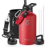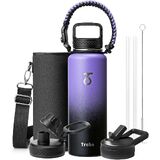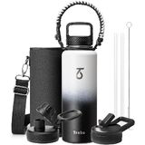 زجاجة مياه تريبو 24 أونصة معزولة بغطاء وقش، قارورة رياضية مزدوجة الجدار من الفولاذ المقاوم للصدأ مع مقبض باراكورد، تحافظ على سخونة 24 ساعة وباردة 48 ساعة كوب ماء مع 3 أغطية، أسود