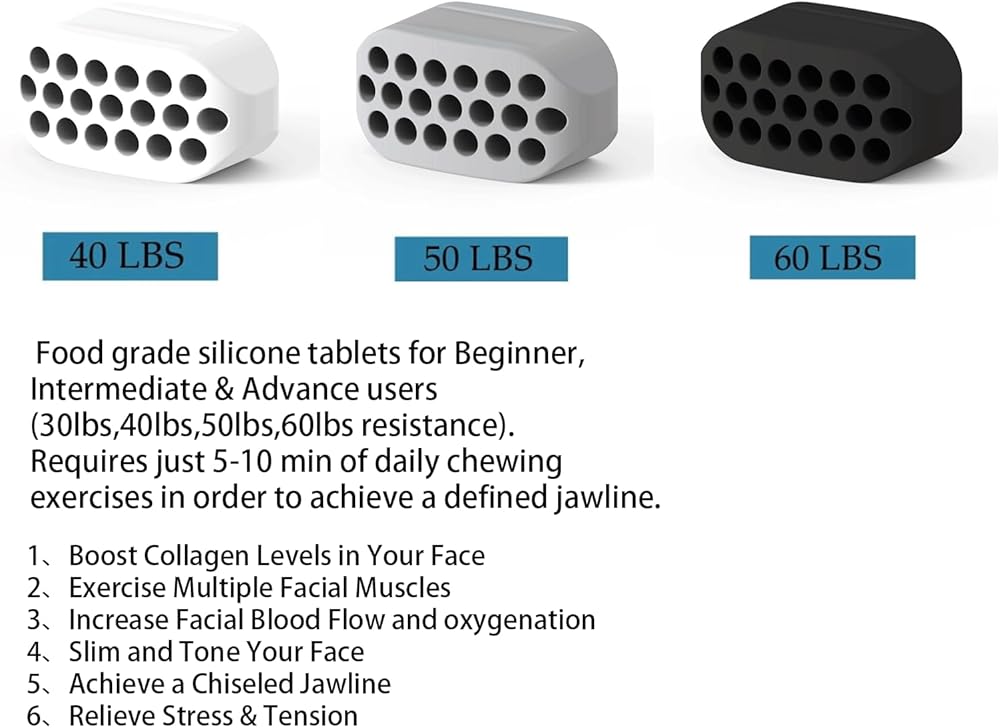 【Package Include】:6Pcs Food grade silicone tablets for Beginner, Intermediate & Advance users (30lbs,40lbs,50lbs,60lbs resistance). Requires just 5-10 min of daily chewing exercises in order to achieve a defined jawline.