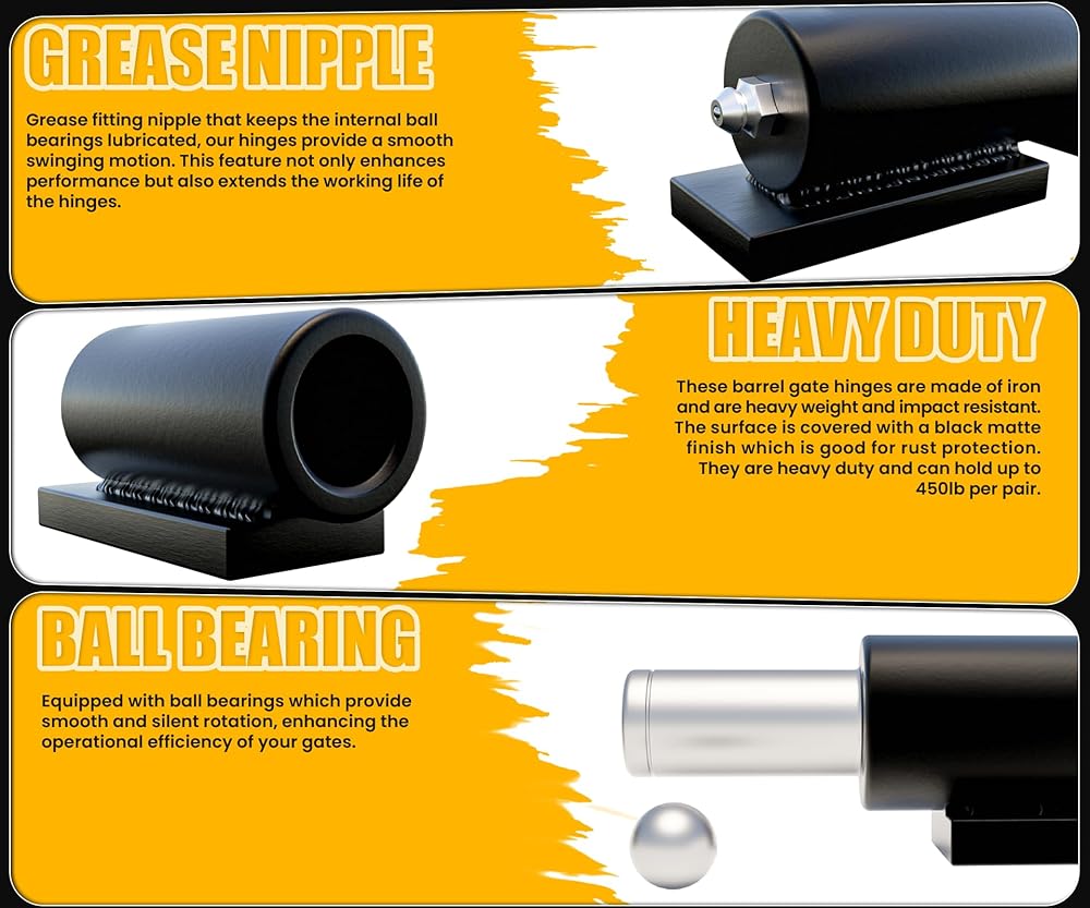 450lb Capacity: Each hinge has a capacity of 450 lbs, ensuring reliable support. Weldable Design to allow secure attachment to gate posts or frames.