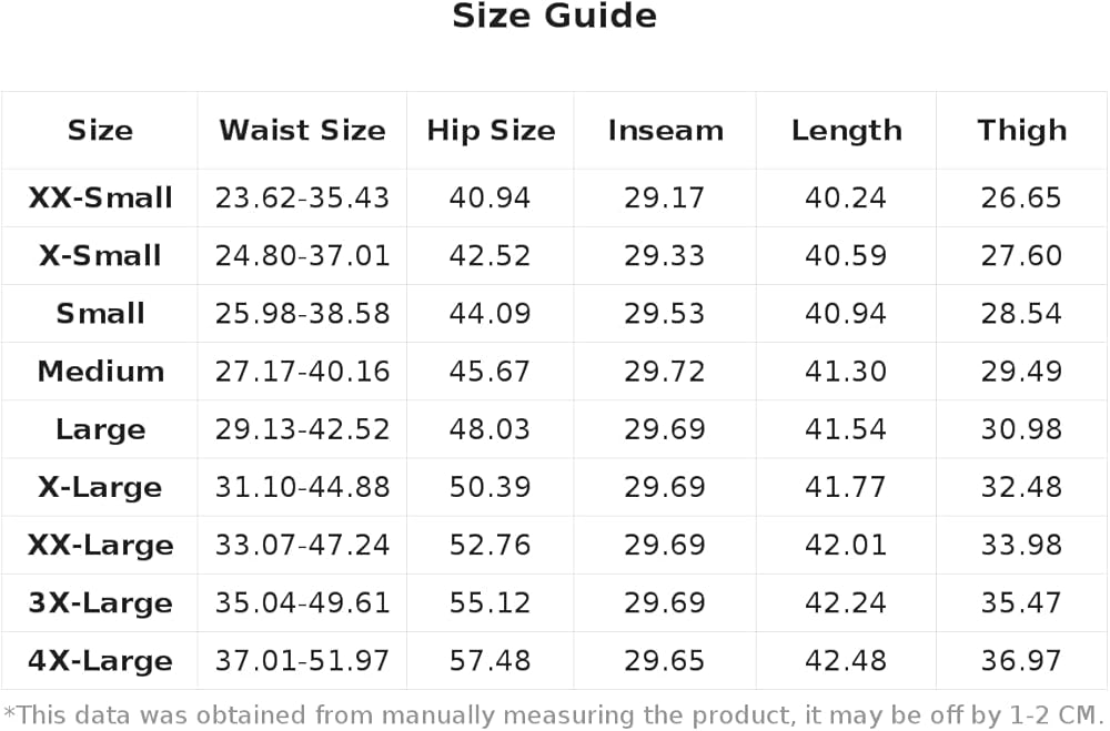 XL:Hip Size:50.4IN,Length:41.8IN,Thigh:32.5IN,Waist Size:31.1-44.9IN