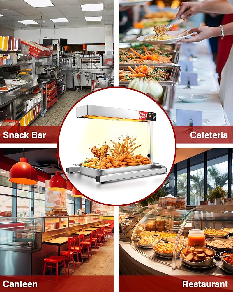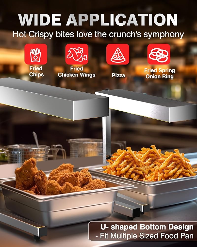 التسخين السريع والمستمر: تم تجهيز مصباح حرارة الطعام لدينا بعنصر تسخين قوي 500 واط ، مما يوفر مدى درجة حرارة متسقة من 122-140 ℉ للدفء الأمثل. تضمن هذه الحرارة الأطباق المقلية ، مثل البطاطس المقلية والدجاج ، الاحتفاظ بمظهر جديد ومثابر ، وتعزيز جاذبية العملاء والرغبة في الشراء.