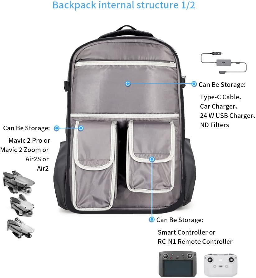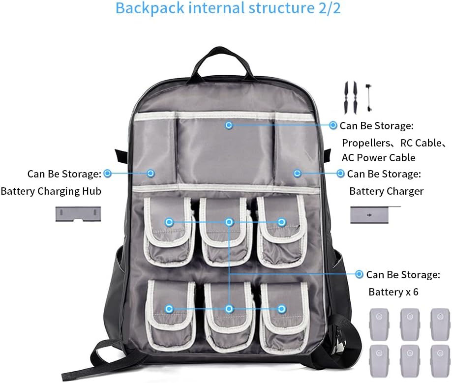 سعة كبيرة، قادرة على التخزين: 6 × بطارية، 1 × مافيك 2 برو/زووم أو اير 2s/2، 1 × وحدة تحكم ذكية أو جهاز تحكم عن بعد RC-N1، 1 × لاب توب وملحقات متنوعة.