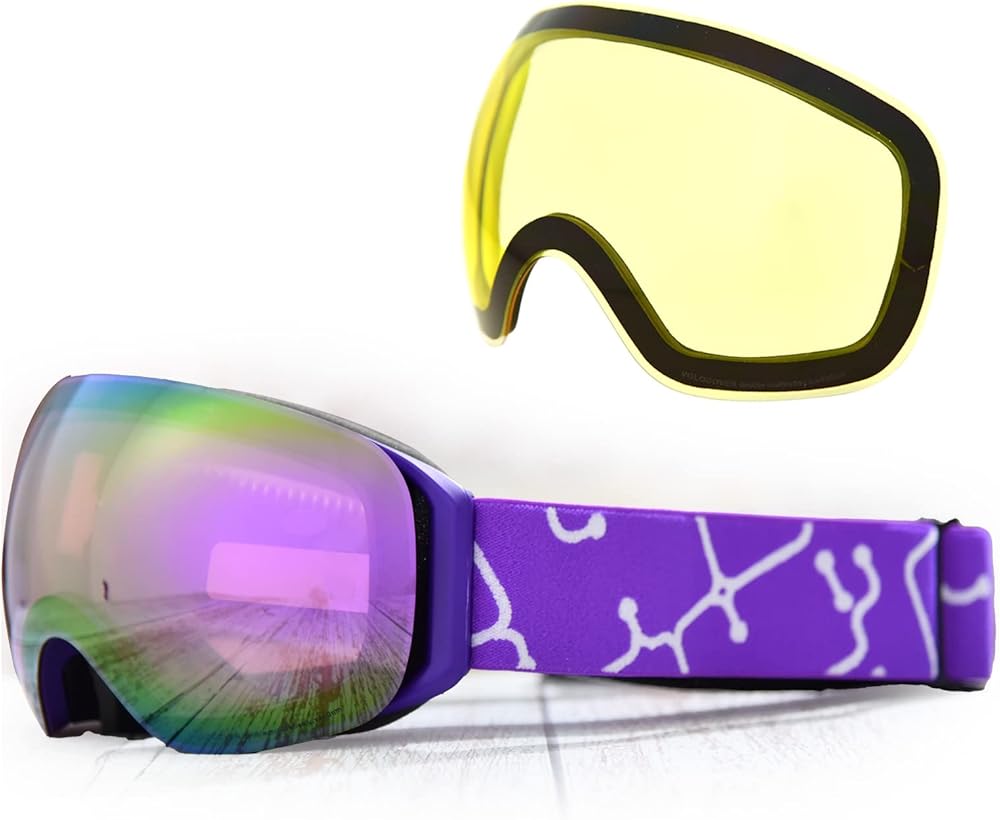 【Quick Changeable two Magnetic adsorption lens 】The ski goggles with Upgrade Quick Changeable Magnetic Lens System - 16 magnet spots hold the lens tightly and securely, easy to replace different lenses for different weather and light conditions wherever and whenever you need.