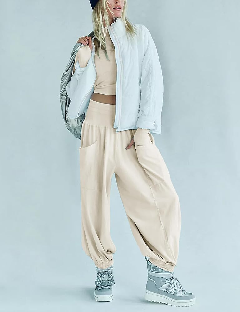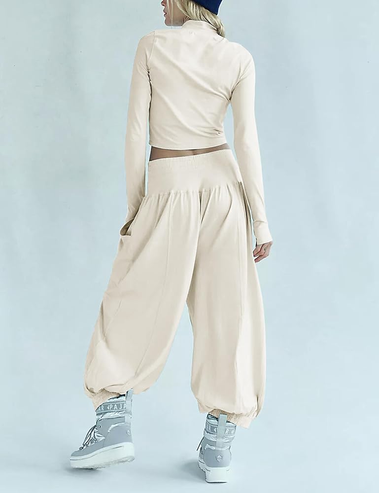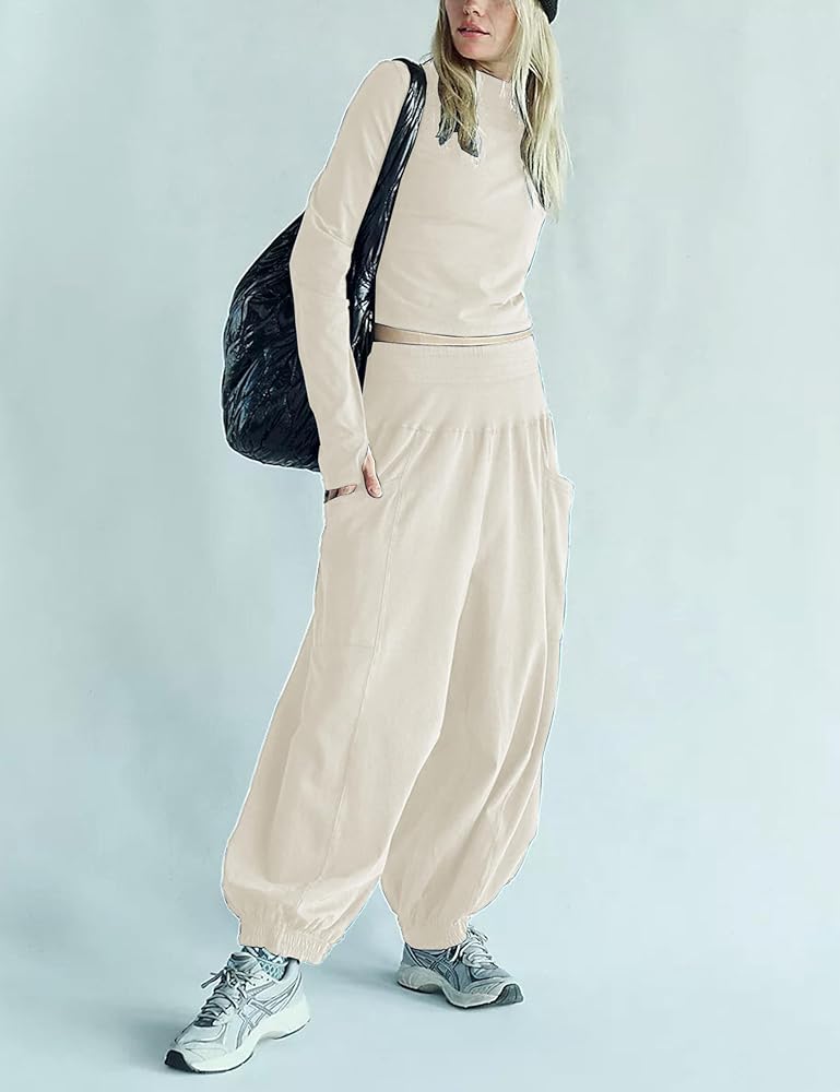 الميزات: الأعلى: خط العنق الوهمي ، الأكمام الطويلة ، تفاصيل الإبهام ، السراويل: التصميم الشاهق ، نمط الساق الواسع ، جيوب مبالغ فيها ، الخصر المرن وأصفاد الكاحل.