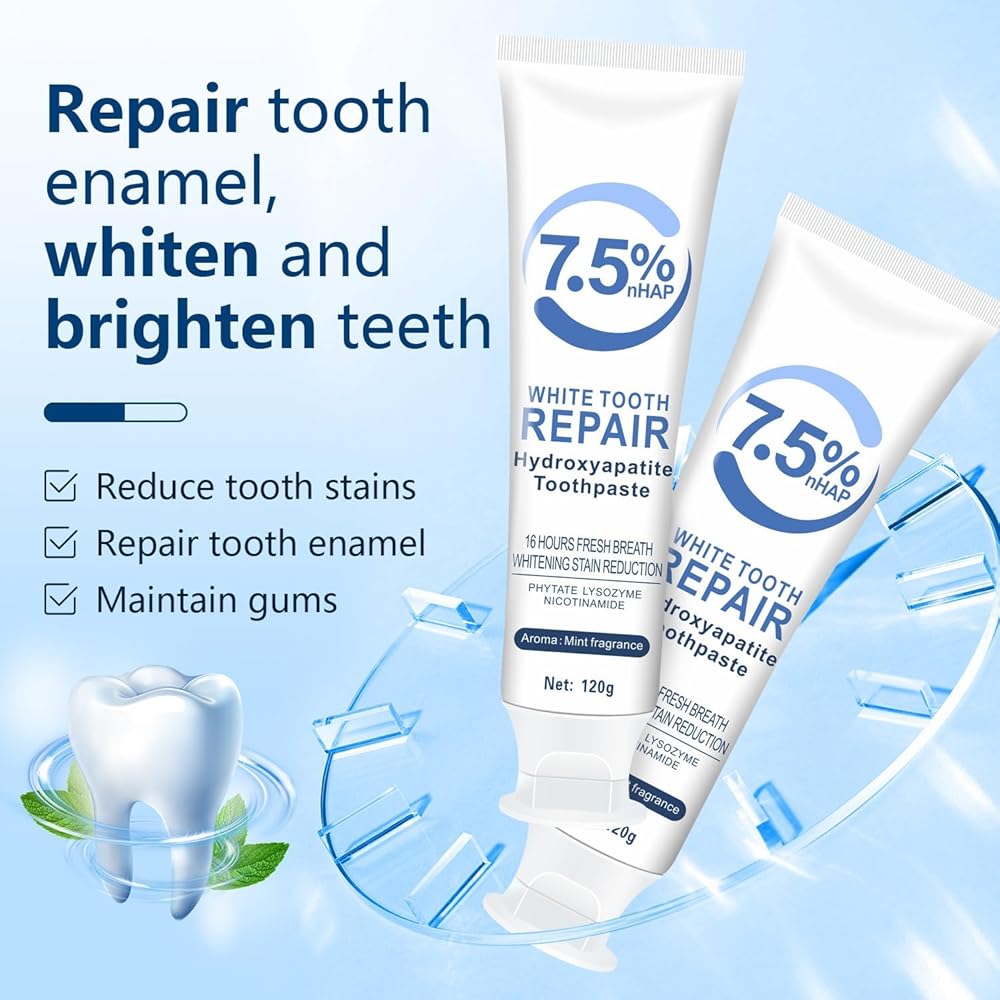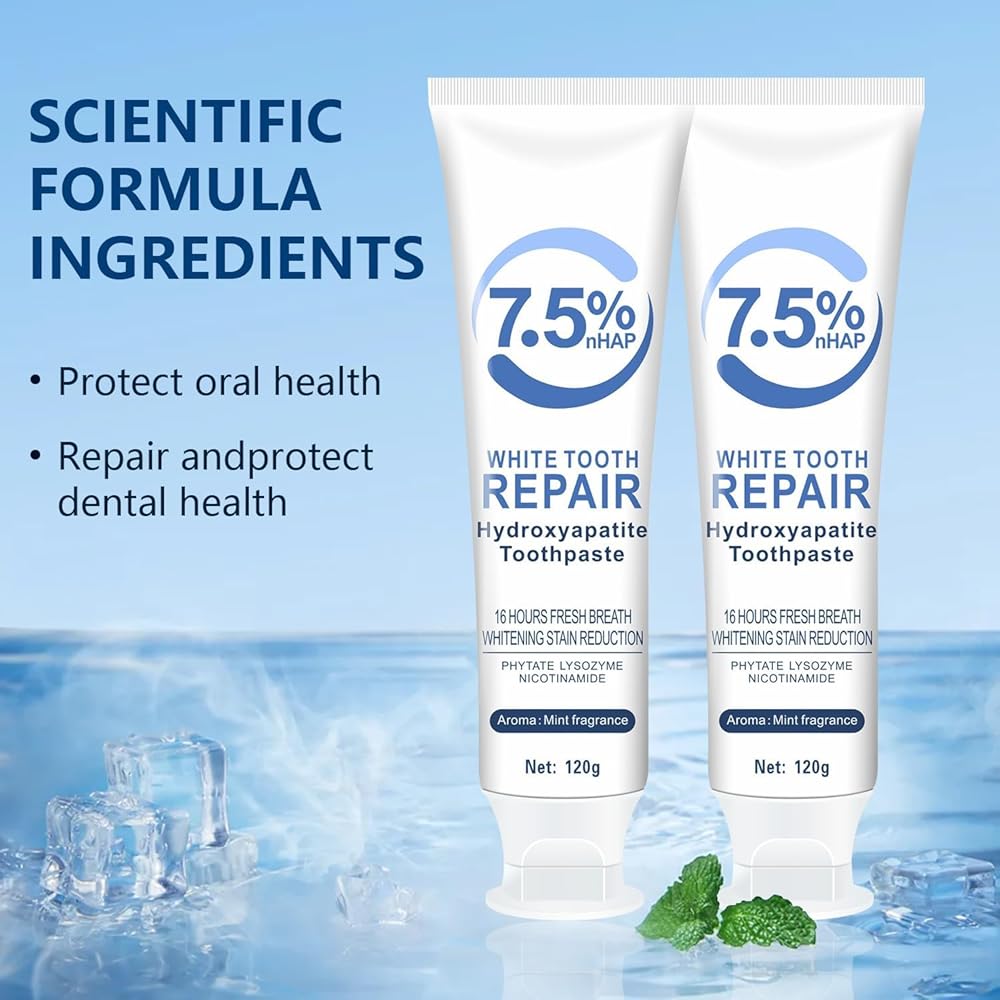 【معجون أسنان هيدروكسيباتيت】 مدعوم من هيدروكسيباتيت ، وهو معدن يحدث بشكل طبيعي يكرر الأسنان من الداخل ، وملء الميكروبور في المينا ، مما يعزز صحة الفم على المدى الطويل
