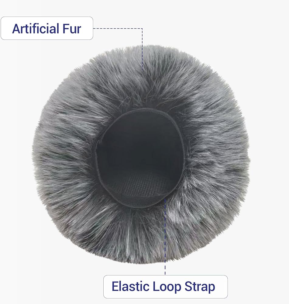 • [غطاء رياح فروي مع حزام حلقة مرن] - يحتوي هذا الزجاج الأمامي للميكروفون المكسو بالفراء على حزام حلقة مرن لتطويق الميكروفون بشكل أفضل.