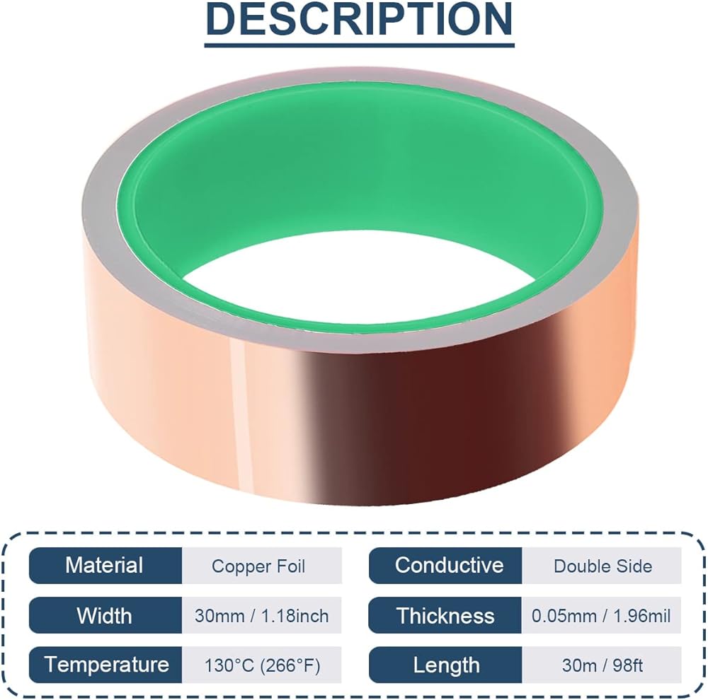 Package Content: The package comes with 1 x Double-Sided Conductive Copper Foil Tape (30mm x 30m)
