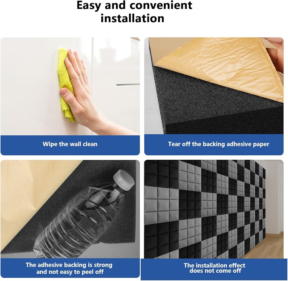 تطبيق سهل مع الدعم الذاتي اللصق: تبسيط عملية التثبيت الخاصة بك مع راحة الدعم الذاتي اللصق. تضمن لوحات العزل الصوتي لدينا إعدادًا خاليًا من المتاعب-قشر الدعم وتطبيق اللوحات لتحويل مساحتك إلى ملاذ محسّن صوتيًا.
