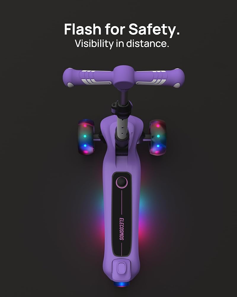 وميض من أجل السلامة - يتميز Elecosmos Kid 3 Scooter Electric Scooter 3 عجلات كبيرة مع محامل ناعمة وسطح عريض LED. يمكن رؤية الأطفال من مسافة بعيدة عند الانزلاق في الجيران. الفرامل الخلفية المعدنية المحسّنة تجعل كل توقف فعال وسلس. KS20 MINI يأتي في 3 ألوان نابضة بالحياة.
