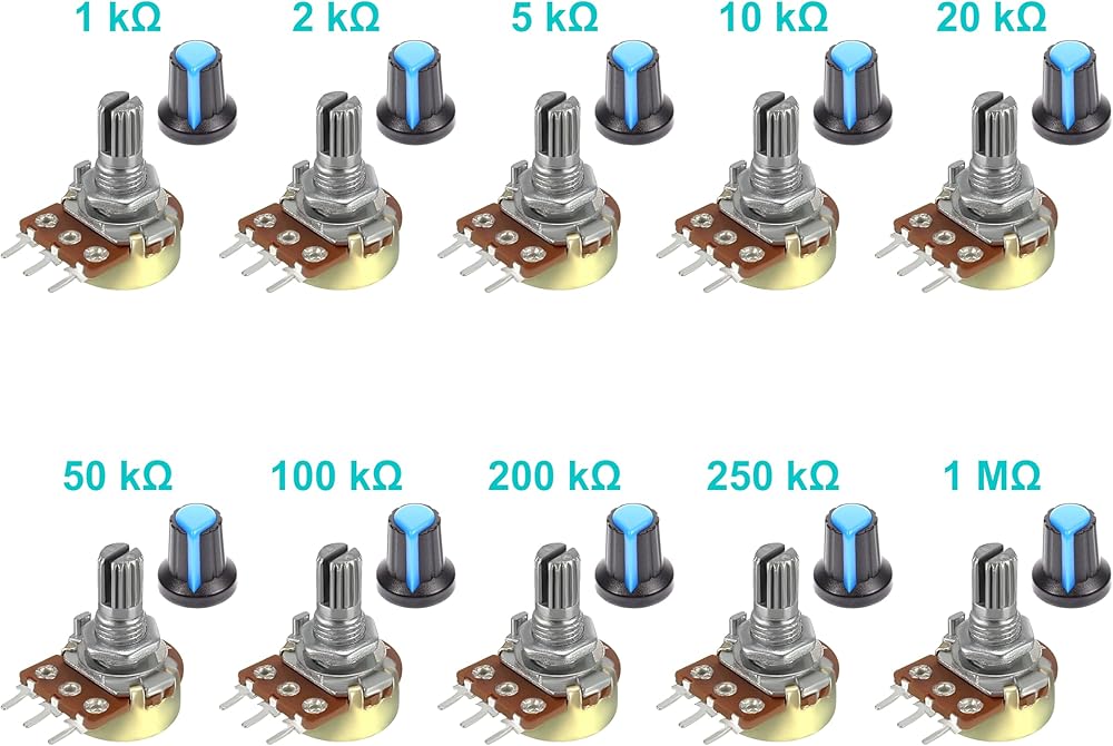 - نطاق مقاومة واسع (10 قيم): 1K أوم، 2K أوم، 5K أوم، 10K أوم، 20K أوم، 50K أوم، 100K أوم، 200K أوم، 250K أوم، 1M أوم.