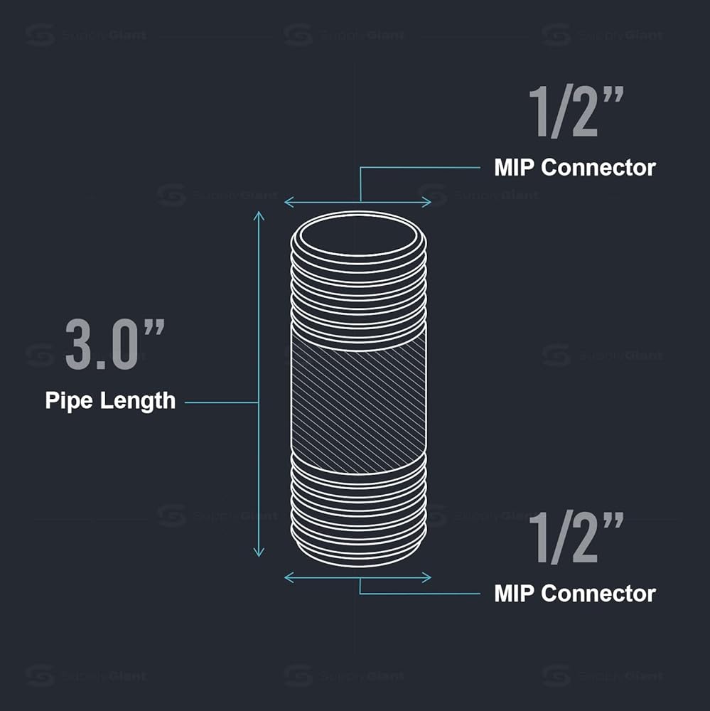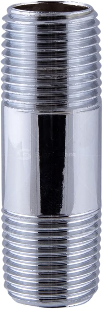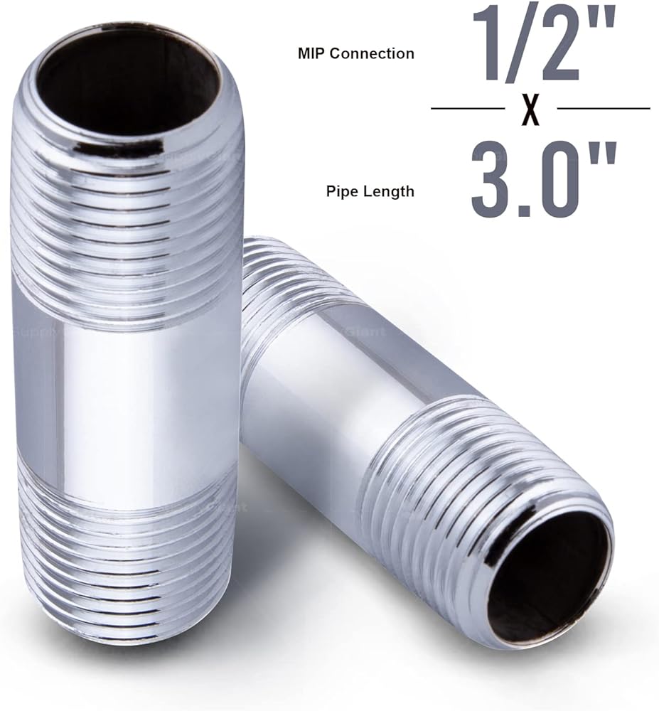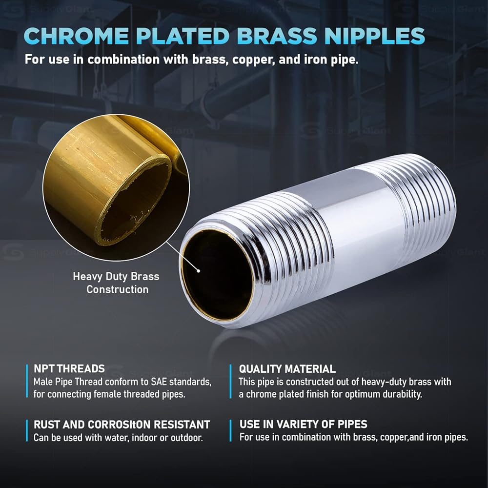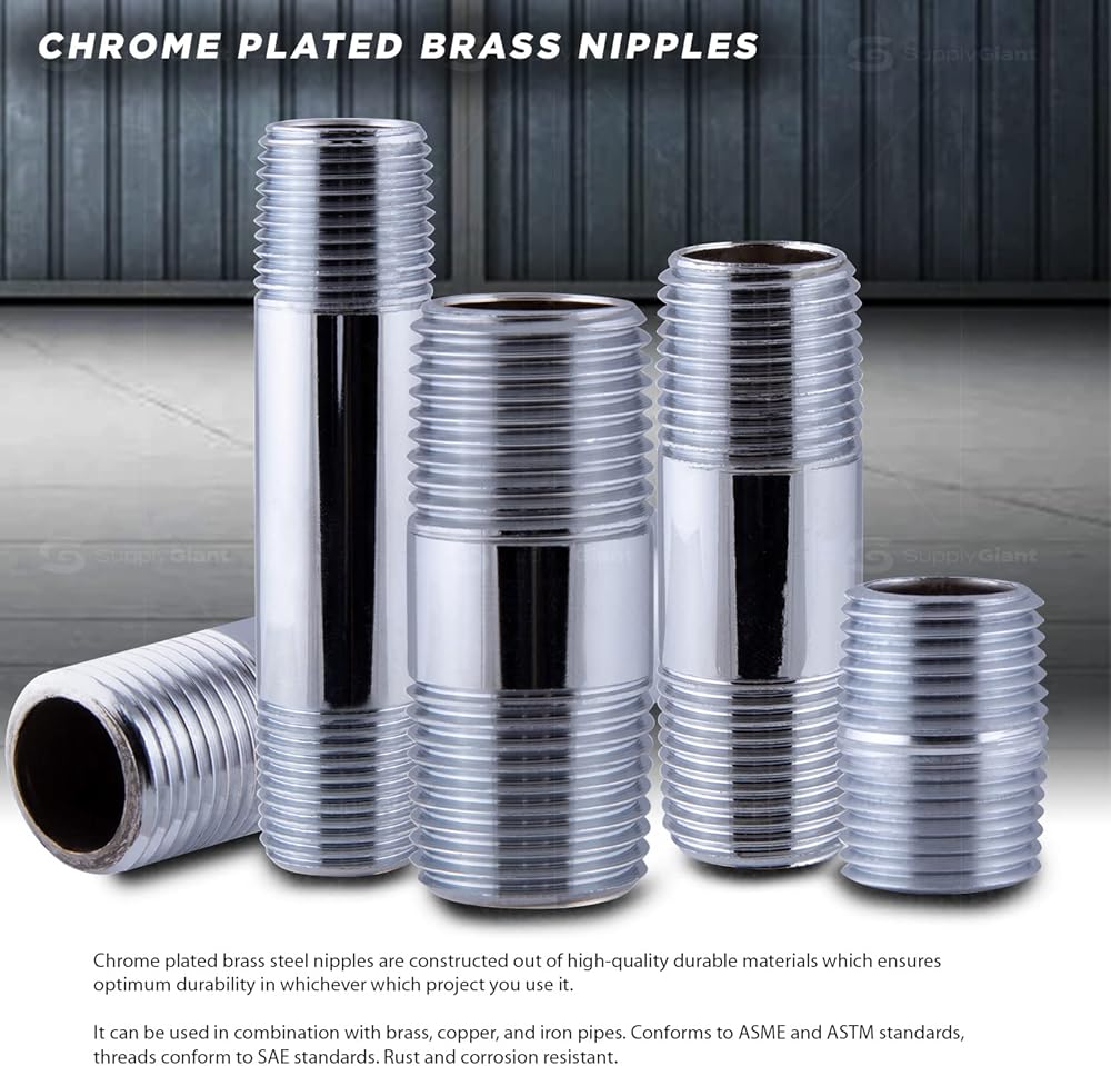 Supply Giant chrome plated brass steel nipples are constructed out of high-quality durable materials which ensures optimum durability in whichever which project you use it. It can be used in combination with brass, copper, and iron pipes. Conforms to ASME and ASTM standards, threads conform to SAE standards. Rust and corrosion resistant.