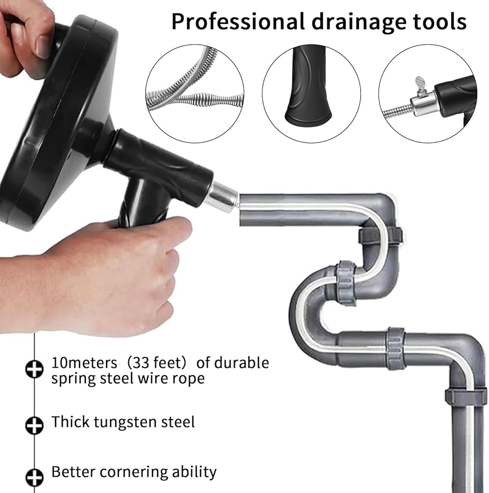 【33 قدمًا من أسلاك الفولاذ المرنة أسهل للوصول إلى السدادات الصعبة】يأتي مثقب تصريف الثعبان الاحترافي هذا مزودًا بكابل فولاذي زنبركي عالي التحمل بطول 33 قدمًا يتجاوز الفخاخ لإزالة معظم السدادات المنزلية. أفضل مثقاب أسطوانة طاقة فعال للغاية لفك انسداد المصارف والحفاظ على تدفق المصارف بسلاسة.