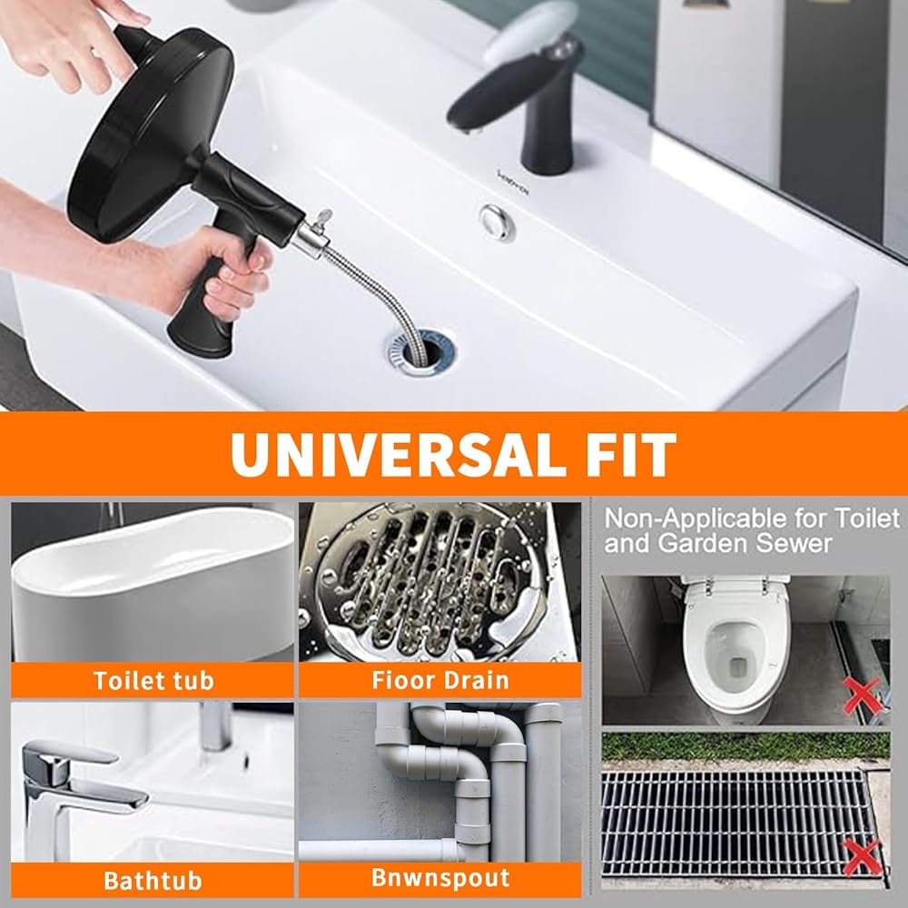 【مجموعة واسعة من التطبيقات】يمكن استخدامها في مصارف مختلفة مثل المطبخ والحمام وأحواض المرافق وأحواض الاستحمام ومصارف الأرضيات لحل معظم مشكلة الانسداد المنزلي. (ثعبان فولاذي لا يُنصح باستخدام مثقاب الطبل هذا للتنظيف. انسداد المرحاض لأن الثعبان قد يتلف الخزف.)