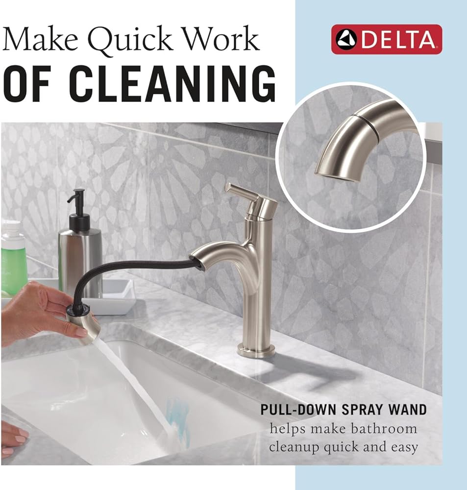 PULL DOWN SPRAYER: The pull down bathroom faucet makes quick work of cleaning toothpaste and dirt from your bathroom sink. MagnaTite Docking uses a powerful magnet to snap the pull down sprayer into place so it stays docked and doesn't droop over time