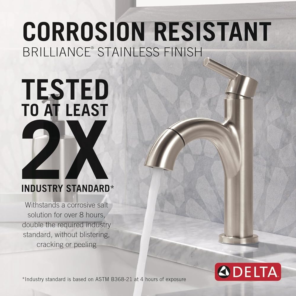 CHEMICAL-RESISTANT SURFACE: Bathroom faucet surface is tested to withstand 16 hours of exposure to 7 harsh cleaning chemicals without corroding or discoloring.