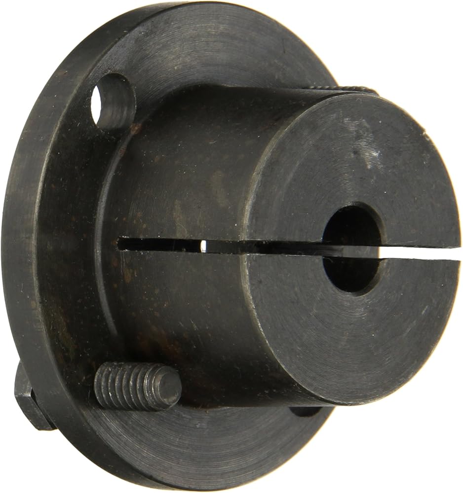 This Martin H MST split taper bushing is made of sintered steel and is used for mounting a split taper bushed pulley, sheave, or sprocket on a drive shaft. It has a solid flange, and the barrel is split in two places to improve concentricity and provide strong clamping on the shaft. The bushing is made of sintered powder steel for greater strength and wear resistance than plain carbon steel. It is keyed to both the shaft and the drive component to provide higher torque carrying capacity and the ability to hold if the fasteners become loose, and it is interchangeable with split taper bushings from various manufacturers. This split taper bushing is used in automobiles, construction equipment, agricultural machinery, and home appliances, among others.