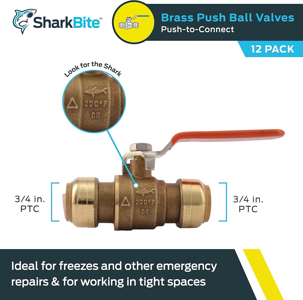 Simplify your plumbing projects with the SharkBite brass push ball valve. Ideal for working in tight spaces, this ball valve allows you to replace or add a new ball valve into an existing line to shut off water flow for servicing and making repairs quickly and easily. This brass plumbing fitting features an intuitive design that can be installed in wet lines. These brass push ball valves are easy to install, compatible with PEX, copper, CPVC, PE-RT, and SDR-9 HDPE pipe, and do not require any special tools, glue, crimping, or soldering for installation. These push-fit ball valves are ideal for freezes, emergency repairs, and other home improvement projects. This plumbing valve can withstand 200 degrees F and 200 PSI.
