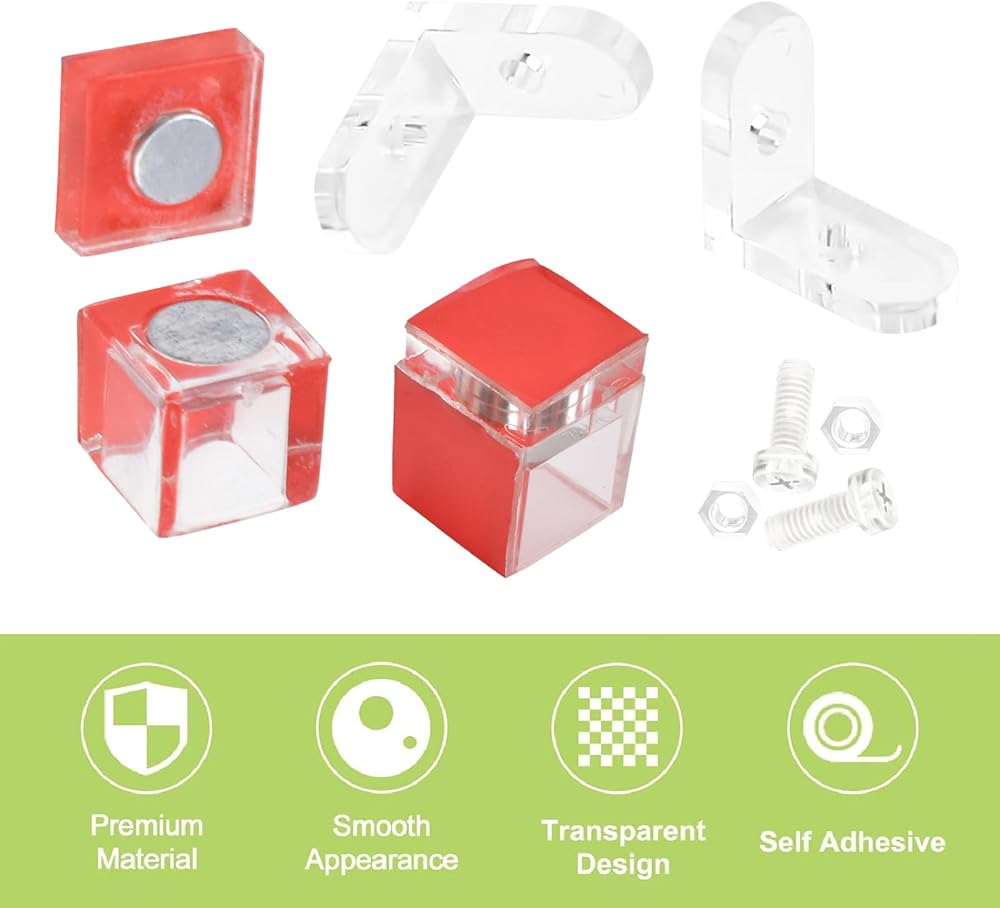 دعامات زاوية شفافة، 16 قطعة من دعامات الأكريليك ذات الزاوية اليمنى مع مجموعتين من المزالج المغناطيسية لخزانة الأكريليك، دعامات شفافة على شكل حرف L 90 درجة دعامة زاوية للعرض الأكريليك
