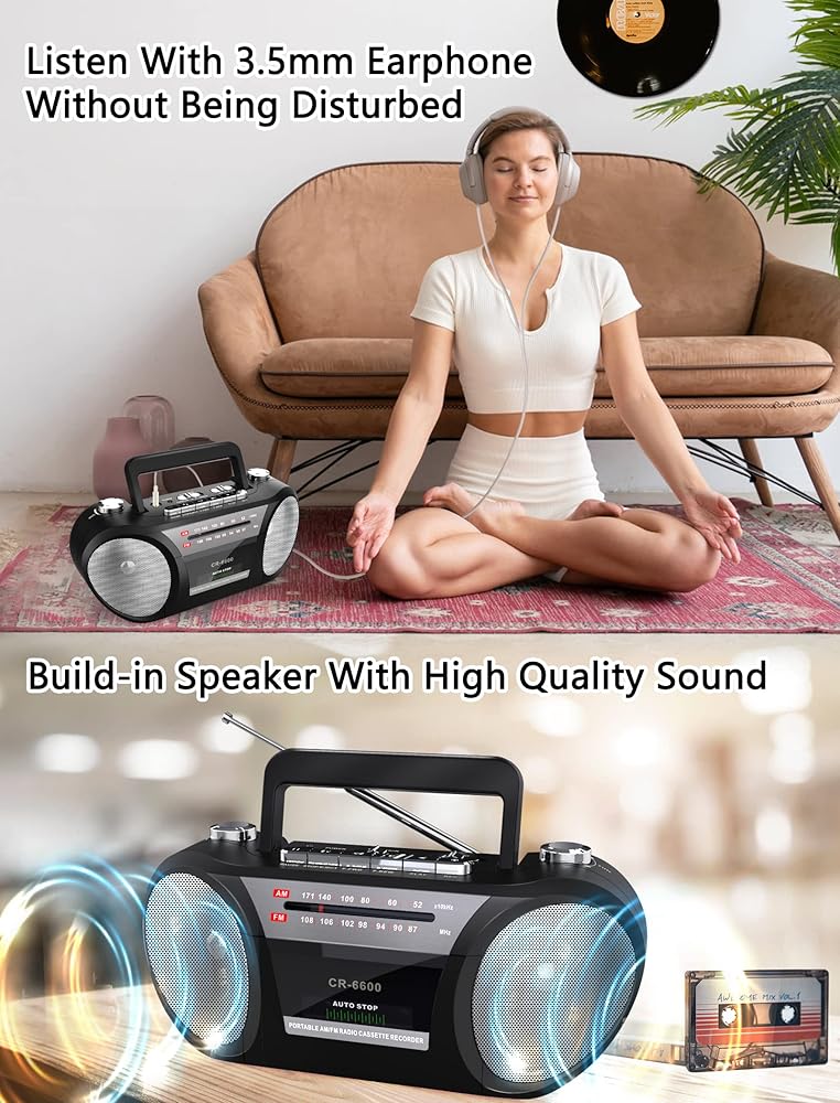 【أفضل صوت مكبر صوت عالي الجودة】يحتوي صندوق البوم على اثنين من مكبرات الصوت المدمجة 6.5 واط تتيح لك تحقيق تشغيل عالي الدقة بدون خسائر. يمكنك تشغيل الأشرطة القديمة التي تقدمها في الدرج، والسماح للصوت بملء الغرفة بأكملها. كما يحتوي صندوق الكاسيت على مقبس سماعة 3.5 مم، لذلك إذا كنت لا تريد إزعاج الآخرين ، فيمكنك توصيل سماعات الرأس والاستمتاع بوقت الموسيقى الشريطية وحدها.