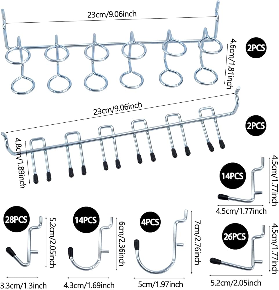 • Complete Set for All Your Needs - Our peg board hooks set consists of 170 pieces divided into 13 different types of hooks and organizers, including curved hooks, angled hooks, straight hooks, and more, ensuring you have the right tool hanger for every item.