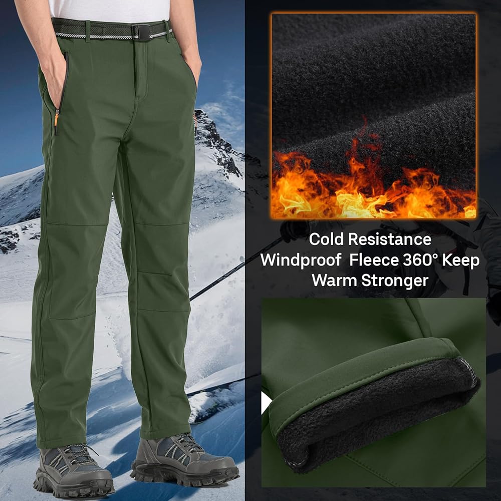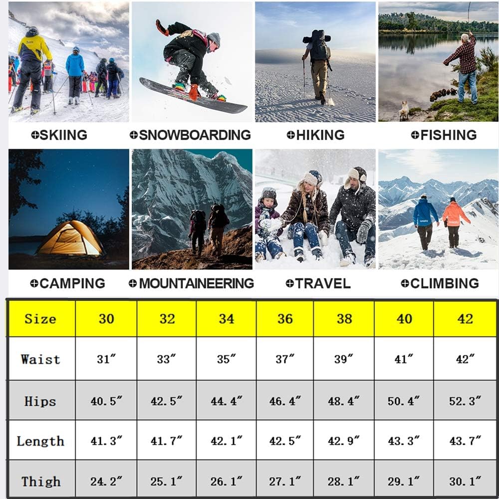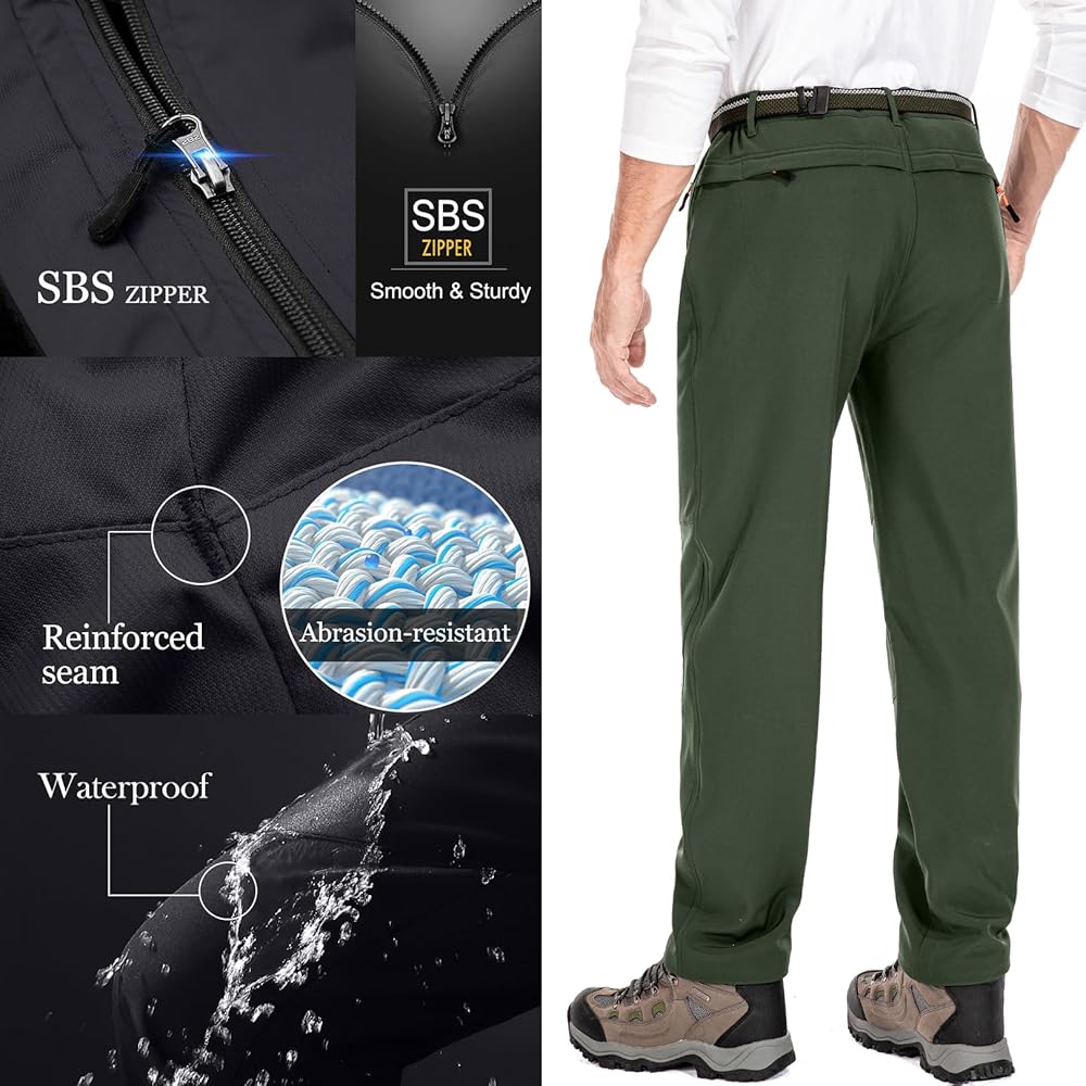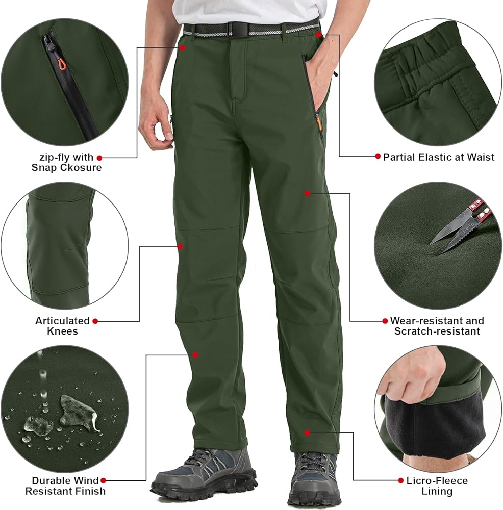 Feature: Surface layer water repellent breathable coating, Mid layer high-end fiber fabric, inner layer polar fleece Premium fleece lining keep you warm in cold weather Waterproof windproof soft shell slim fit and elastic wear, zipper closure Perfect for cold weather outdoor sports like camping, hiking, climbing, travelling, snow ski, mountaineering, cycling, huntingSTAY WARM: Snow Ski Fleece Lined Pants are made of 94% Scratch-resistant Polyester 6% Stretch Spandex soft shell fabric and lining with 100% Soft Polar Fleece. Anti-static Fleece Lining with skin-friendly property offers you with superior moisture wicking treatment, no pilling, breath freely, keep warmth and dry from the inside out while the Spandex provides the excellent comfort and flexibility. WATER RESISTANT & WINDPROO Fleece lined pants men: Surface layer is designed with Water Repellent Coating obviously repels rain and snow, cuts the wind, that pulls moisture away to keep you cool and dry during the winter sports, while maintain good breathability. Resists wrinkle, no fade soft shell with premium fleece lining fabric, give your skin a soft touch and effectively lock the heat, also perfect in windproof and snowproof, which is very suitable for outdoor adventure. MULTI-POCKETS & ERGONOMIC DESIGN: 4 Secured Zipper Pockets can keep your phone, wallet, key, tactical gears or other accessories for ultimate safely, convenience and efficiency while moving. Freedom of movement - Stretch Spandex Softshell Pants featured with articulated knees provides great flexible, full mobility and perfectly fit. 3D tailoring with exquisite stitching make the Cargo Hiking Pants more suitable and stylish. Elastic waist pants:Slim fit hiking pants featuring adjustable waistband with belt,patckwork knees,steric knee darts and unique zippered cargo pockets on thigh part Waterproof ski pants:Water repellent windproof outdoor pants with fleece