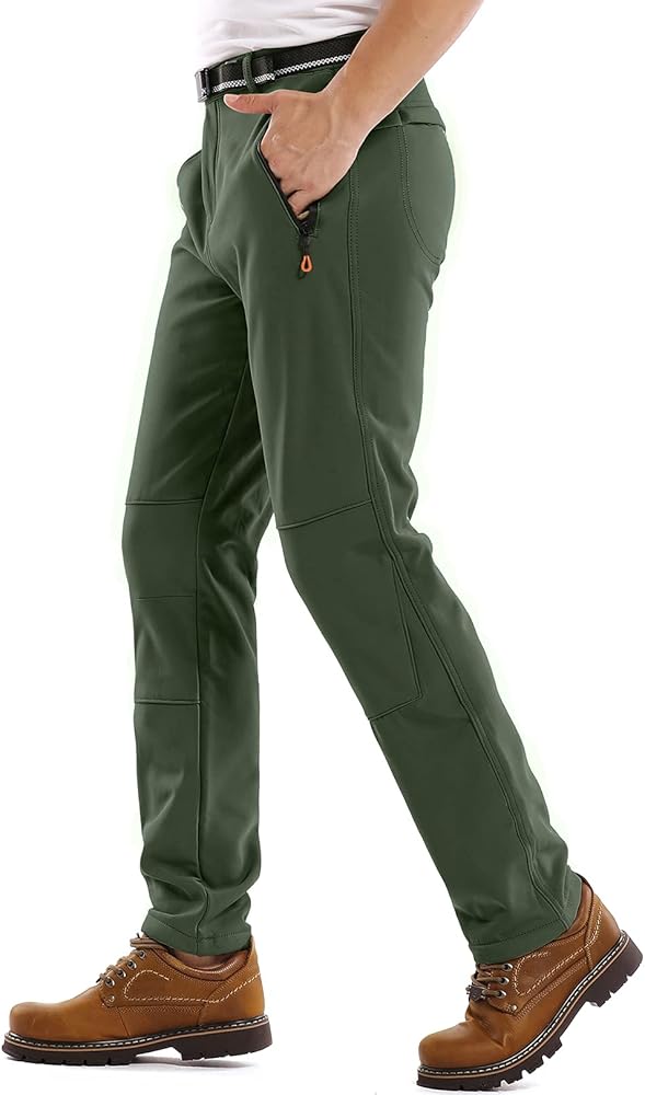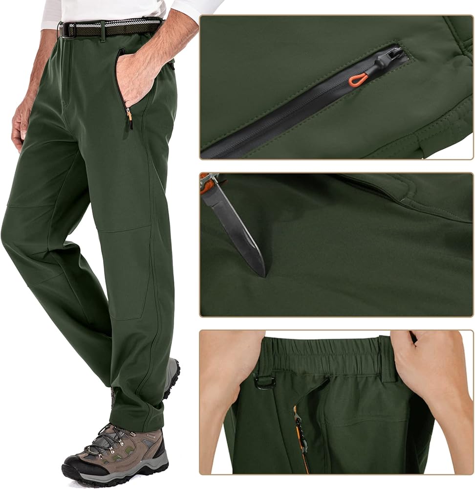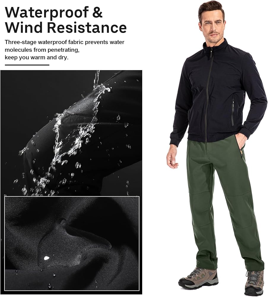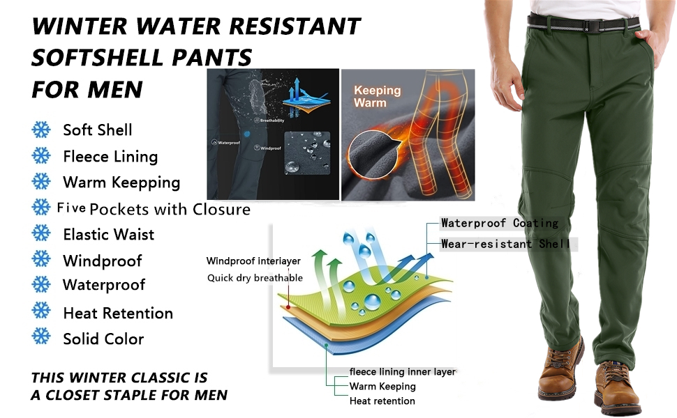 Feature: Surface layer water repellent breathable coating, Mid layer high-end fiber fabric, inner layer polar fleece Premium fleece lining keep you warm in cold weather Waterproof windproof soft shell slim fit and elastic wear, zipper closure Perfect for cold weather outdoor sports like camping, hiking, climbing, travelling, snow ski, mountaineering, cycling, huntingSTAY WARM: Snow Ski Fleece Lined Pants are made of 94% Scratch-resistant Polyester 6% Stretch Spandex soft shell fabric and lining with 100% Soft Polar Fleece. Anti-static Fleece Lining with skin-friendly property offers you with superior moisture wicking treatment, no pilling, breath freely, keep warmth and dry from the inside out while the Spandex provides the excellent comfort and flexibility. WATER RESISTANT & WINDPROO Fleece lined pants men: Surface layer is designed with Water Repellent Coating obviously repels rain and snow, cuts the wind, that pulls moisture away to keep you cool and dry during the winter sports, while maintain good breathability. Resists wrinkle, no fade soft shell with premium fleece lining fabric, give your skin a soft touch and effectively lock the heat, also perfect in windproof and snowproof, which is very suitable for outdoor adventure. MULTI-POCKETS & ERGONOMIC DESIGN: 4 Secured Zipper Pockets can keep your phone, wallet, key, tactical gears or other accessories for ultimate safely, convenience and efficiency while moving. Freedom of movement - Stretch Spandex Softshell Pants featured with articulated knees provides great flexible, full mobility and perfectly fit. 3D tailoring with exquisite stitching make the Cargo Hiking Pants more suitable and stylish. Elastic waist pants:Slim fit hiking pants featuring adjustable waistband with belt,patckwork knees,steric knee darts and unique zippered cargo pockets on thigh part Waterproof ski pants:Water repellent windproof outdoor pants with fleece
