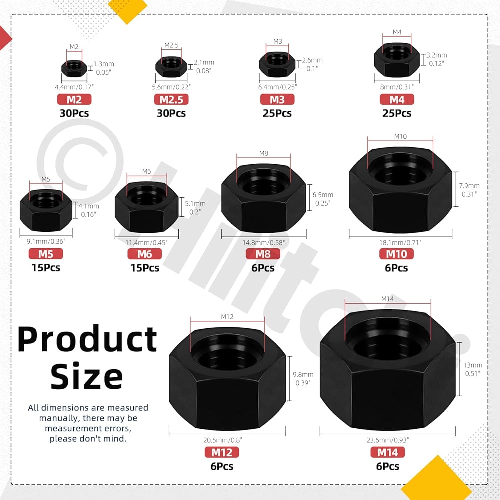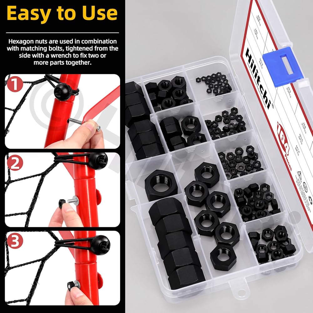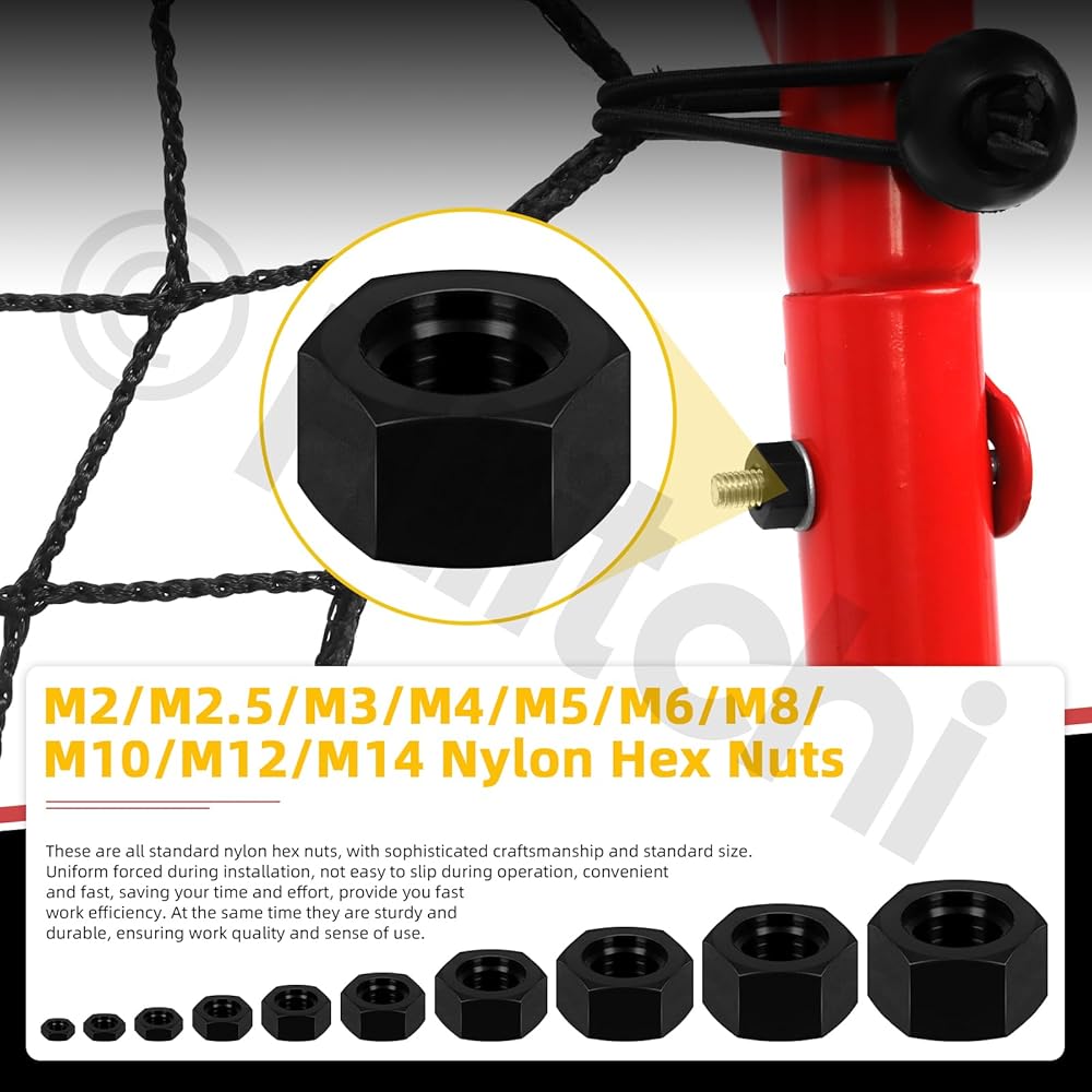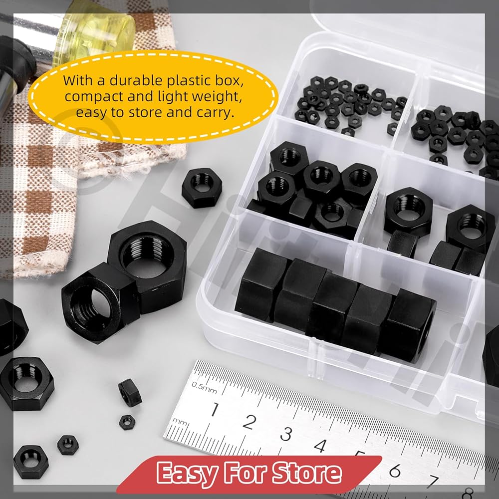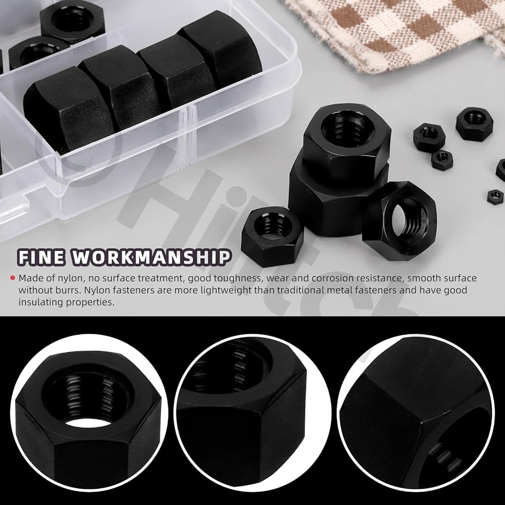 164 قطعة من صواميل سداسية من النايلون الأسود من Hilitchi M2 M2.5 M3 M4 M5 M6 M8 M10 M12 M14 متري خيط خشن من النايلون مجموعة متنوعة من صواميل سداسية من النايلون للمنزل الصناعي ومثبتات بناء السيارات
