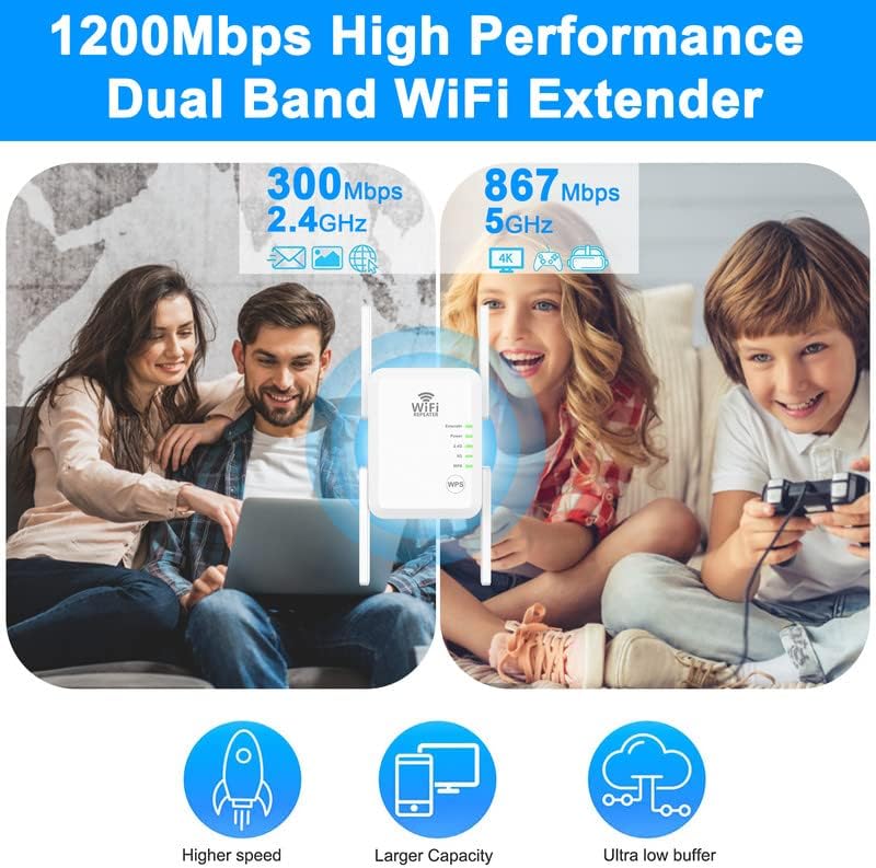 • ✅【1200Mbps Stable Signal Booster&360°Full Coverage】 This WiFi extender booster comes with dual band technology, provide up to 300Mbps for 2.4GHz, up to 867Mbps for 5Ghz, 360 degree high-speed connection for happy Surfing HD video and online game. Boosts your WiFi Range and Connects up to 45 Devices such as Smartphones,Laptops, Tablets, Speakers, IP Cameras and more.