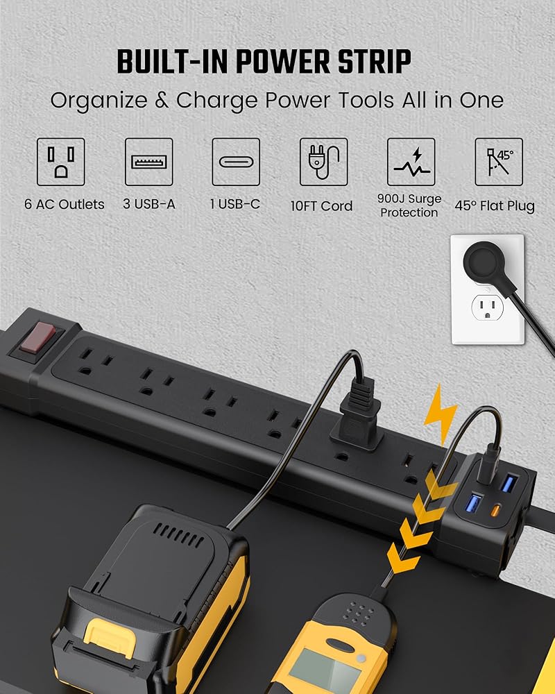 SPACE for Power Strip: تتميز الطبقة العليا بفتحة محددة لشريط الطاقة الخاص بك (غير مدرج) جنبًا إلى جنب مع الثقوب على كلا الجانبين لسهولة الوصول إلى سلك الطاقة. يمكنك إرفاق شريط الطاقة الخاص بك لشحن البطاريات والأدوات أثناء تخزينها. تتيح لك فتحات الحبل الاتصال بمنفذ طاقة على الجانب الأيسر أو الأيمن ، مما يجعله مناسبًا لإدارة الطاقة في طاولة عملك ، وإصلاح الزاوية ، ومنطقة الأعمال الخشبية ، إلخ.