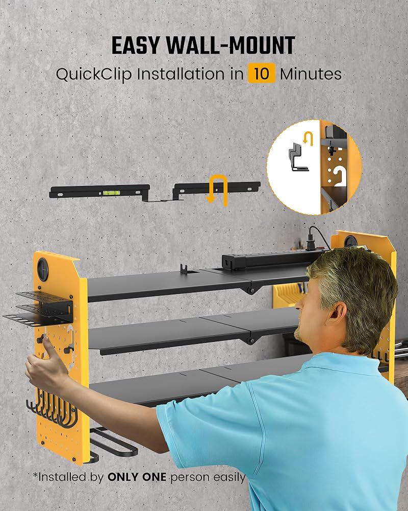 تباعد الطبقة القابلة للتعديل السهل: يمكن تعديل المستوى الثاني من منظم أدوات الطاقة في الحائط بسهولة لاستيعاب أدوات أكبر مثل صناديق الأدوات ، والمناشير الدائرية ، والرقص ، وطحن الزاوية. يمكنك تحريكه إلى واحد من ثلاثة مواقع للتباعد القياسي أو الأصغر أو الأكبر دون أي أدوات. أو إذا لزم الأمر ، يمكنك إزالة الطبقة القابلة للتعديل بالكامل لحل التخزين المخصص ، دون التضحية بقوة الحامل.