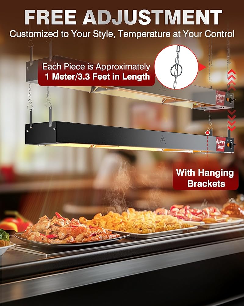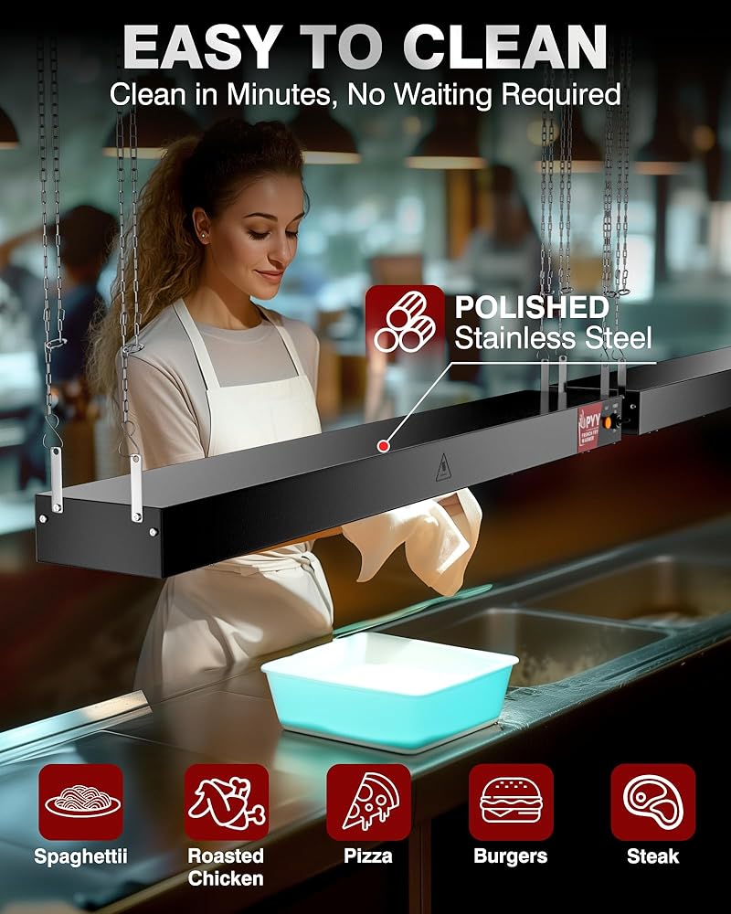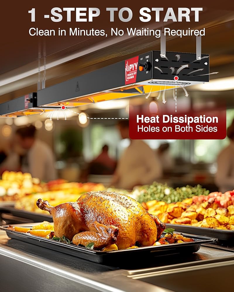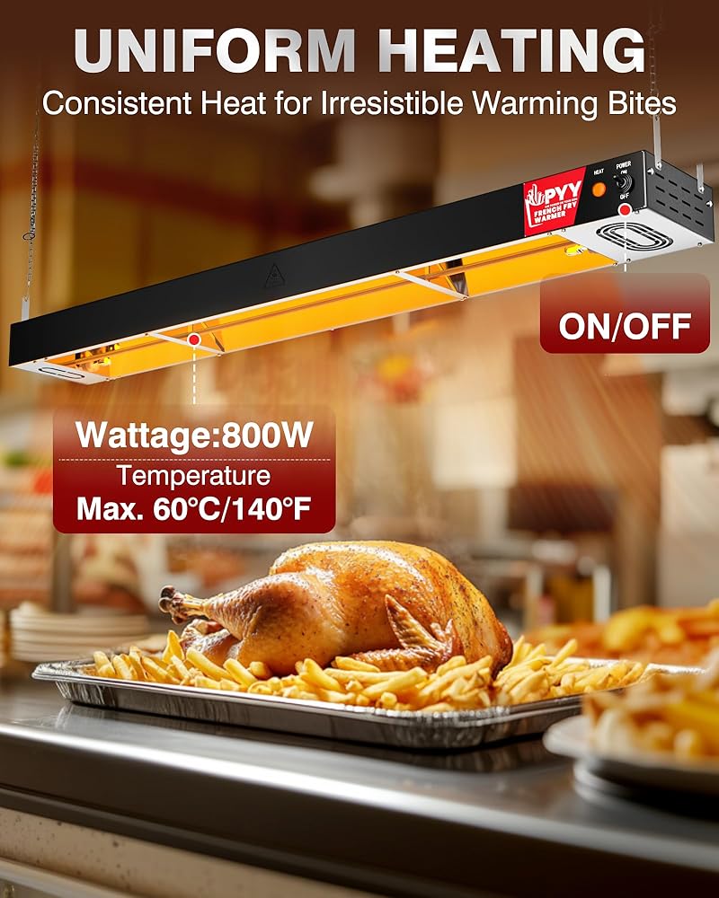 تسخين سريع وتدفئة ثابتة ومستمرة: يتميز مصباح تسخين الطعام المعلق PYY بأنبوب تسخين من الفولاذ المقاوم للصدأ بقدرة 800 وات. يتم تسخينه بسرعة إلى حوالي 60 درجة مئوية/140 درجة فهرنهايت، مما يضمن تسخين طعامك بسرعة ويبقى في درجة حرارة ثابتة، مما يوفر تجربة طعام دافئة ولذيذة. مصابيح الإضاءة الدافئة المضافة حديثًا تجعل طعامك يبدو أكثر شهية