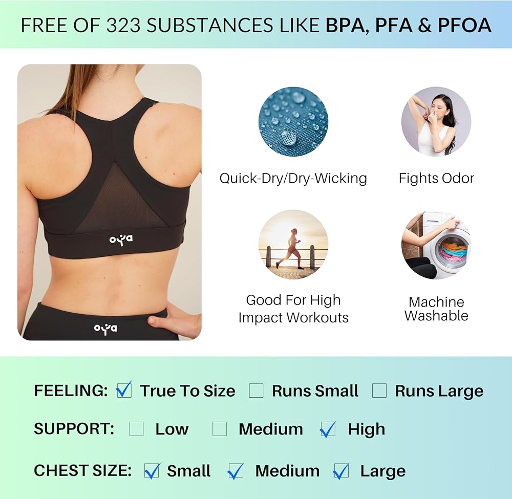 OYA High Impact Front zip Sports Bra للبشرة الحساسة ، الأسود ، XL