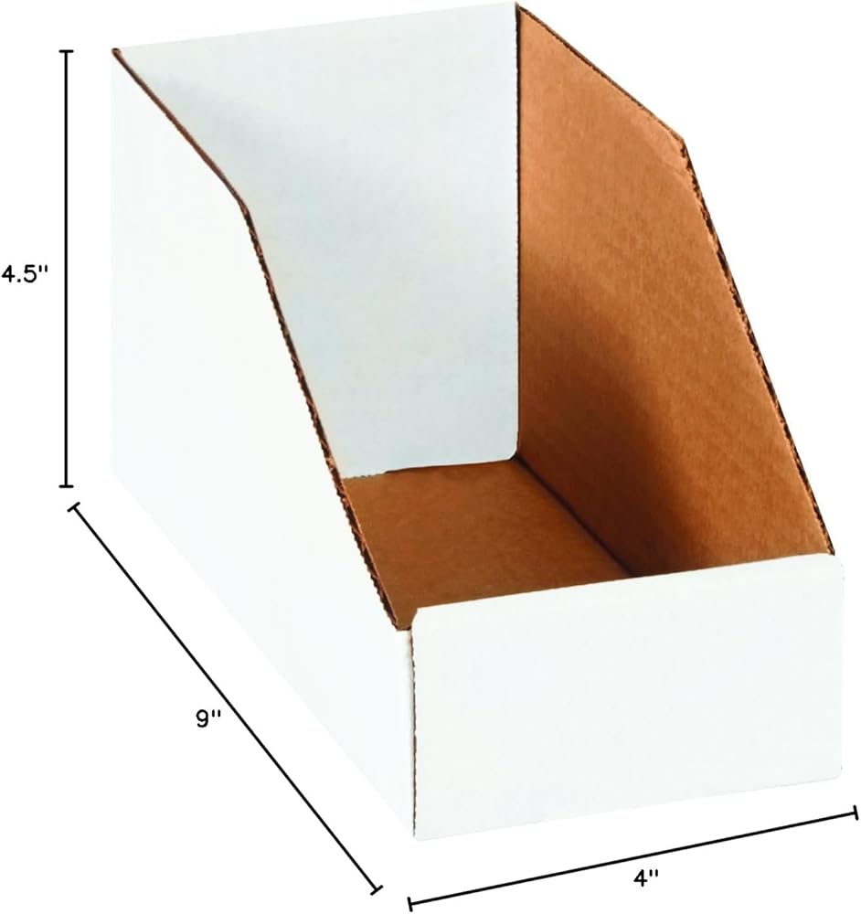4 inch x 9 inch x 4 1/2 inch open top bin boxes. Easy to assemble. Ideal for organizing work areas. Durable one-piece construction. Assemble without tape or staples. Ample space to identify contents on front panel with marker or labels. Made from strong 200#/ect-32-b Oyster White corrugated. Ships and stores flat.