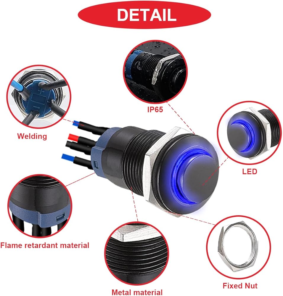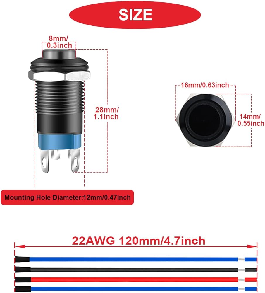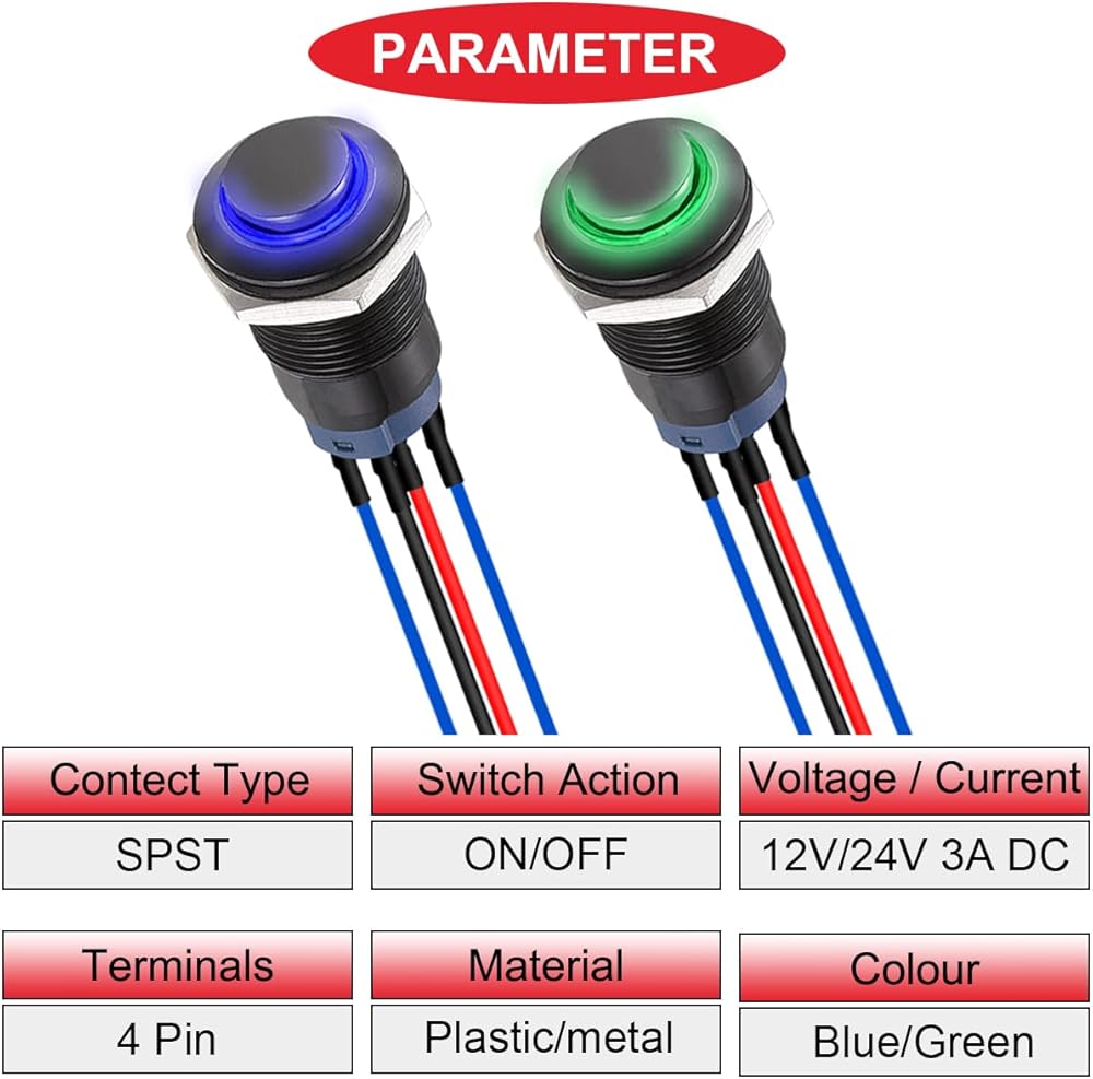 SPECIFICATIONS:Rated Voltage and Current:12V 24V 3A DC;Positions:2 (ON/OFF);Pin Quantity:4;Contact Type:SPST;Protection Degree:IP65;Mounting Type:Panel Mount;Mounting Hole Diameter:12mm/0.47inch;Wire Gauge:24AWG;Cable Length:120mm/4.7inch;LED Color:Blue/Green.