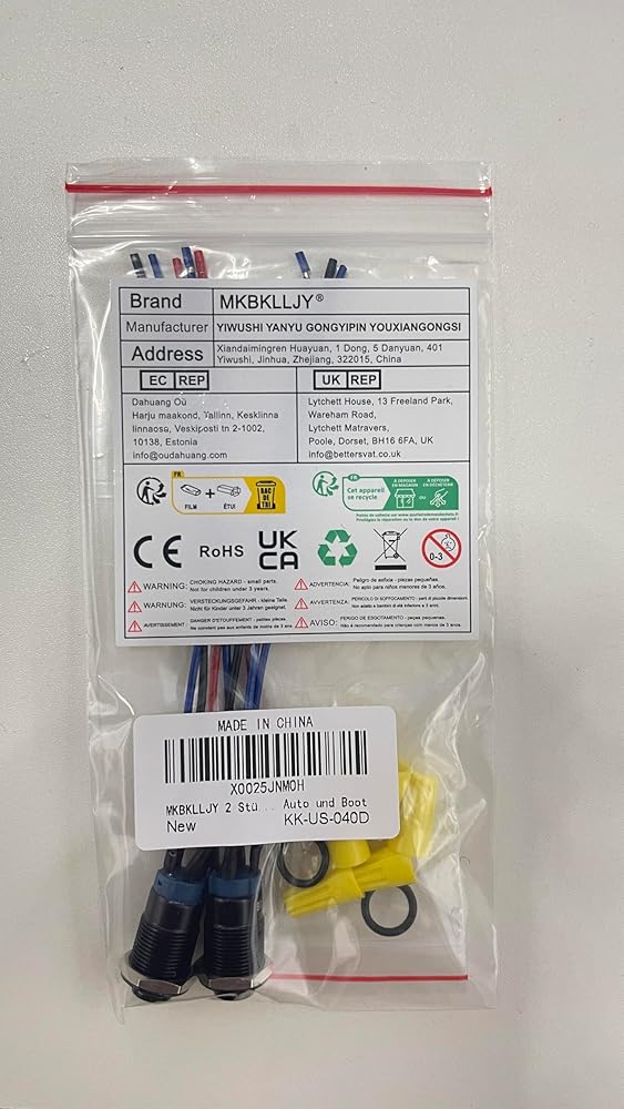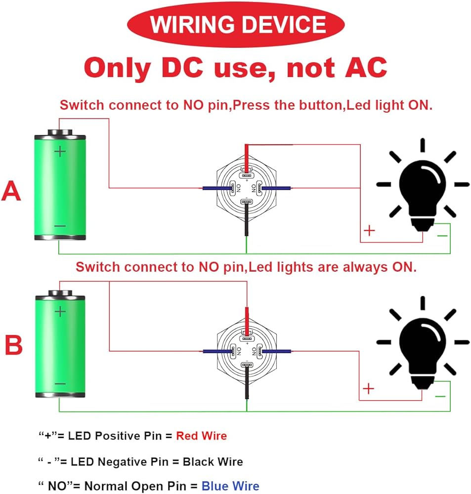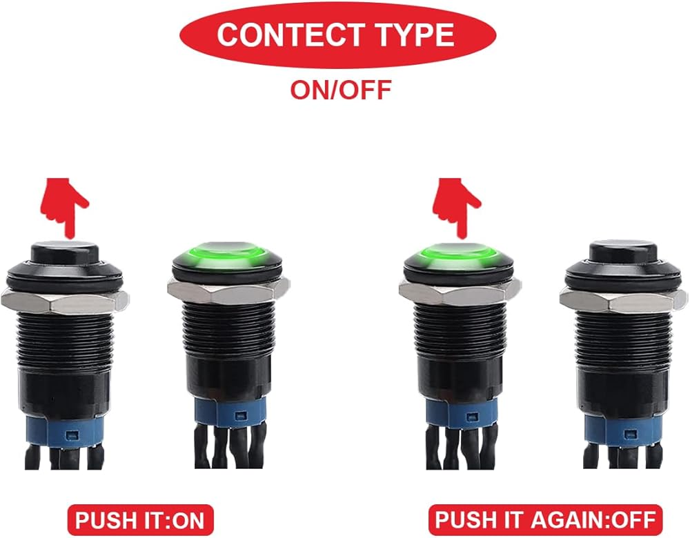 PACKAGE CONTENT:1 x Blue LED Latching Push Button Switch with Terminal Wires;1 x Green LED Latching Push Button Switch with Terminal Wires;5 x Wiring Cap.